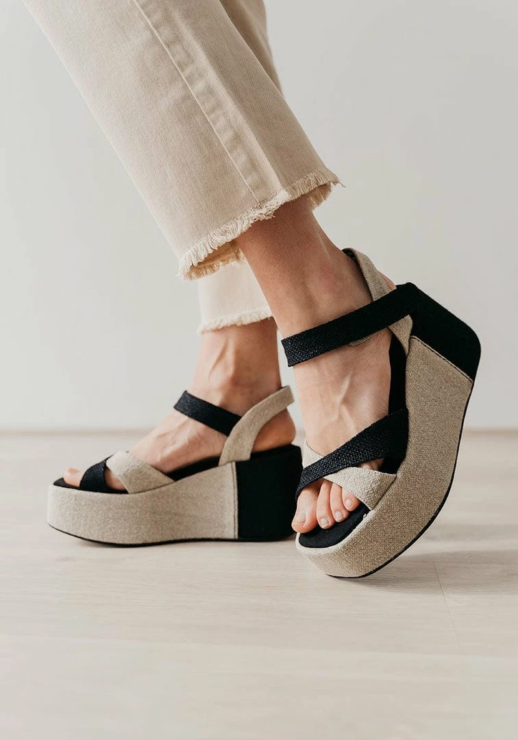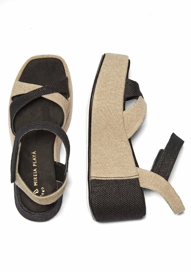- Upper & platform lining: Beige recycled linen fabric (44% LI REC, 32%CO, 24%LI) and black jute and cotton fabric (50%JU, 50% ORG CO)