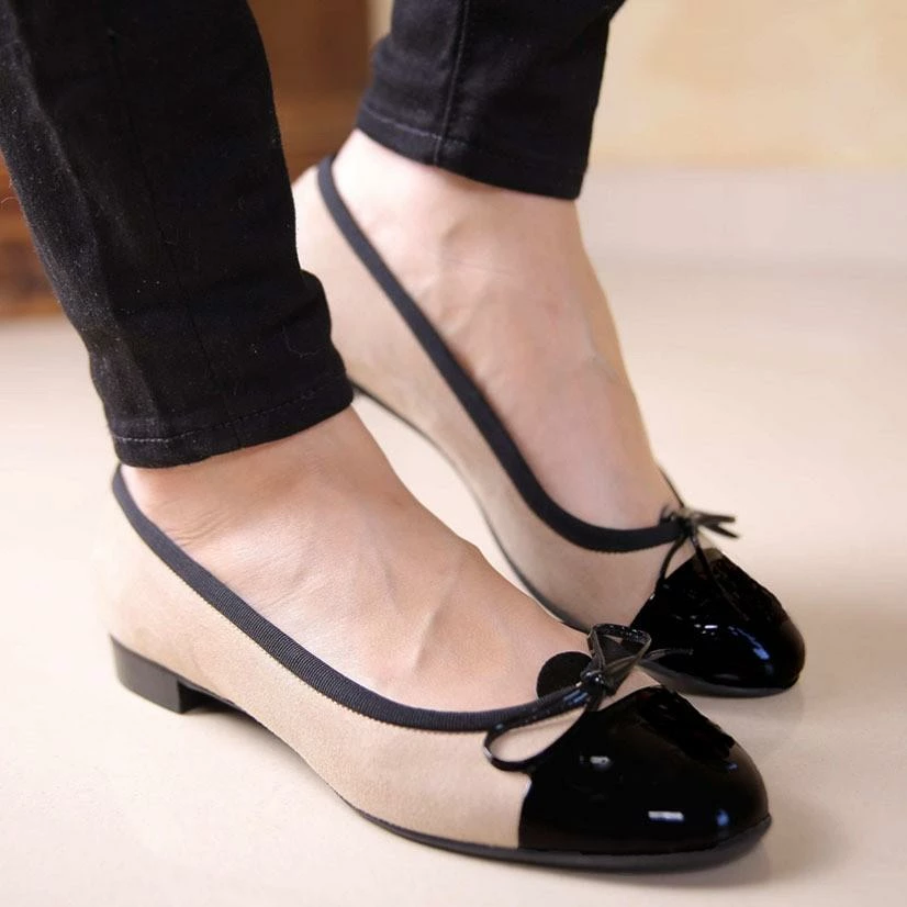 Sand-coloured upper, black patent toe and a small bow that, together with the grosgrain fabric ribbon, frames the silhouette of this timeless shoe.