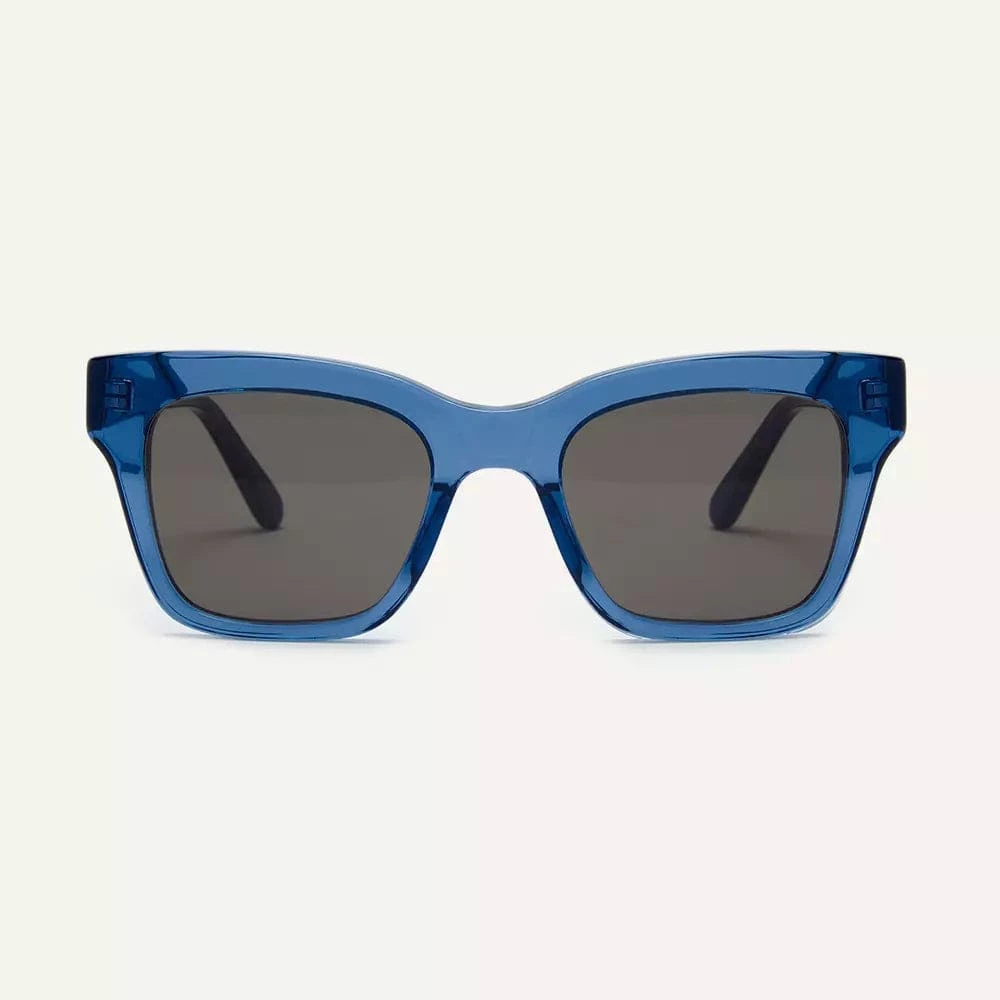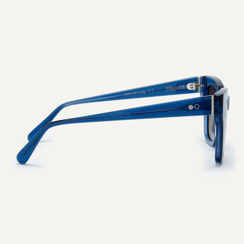 Malaika’s thicker square shape and clean silhouette is beautifully balanced, providing a modern take on a design that draws its inspiration from the spirit of the Sixties. In transparent deep blue bio-acetate with grey Grilamid lenses.