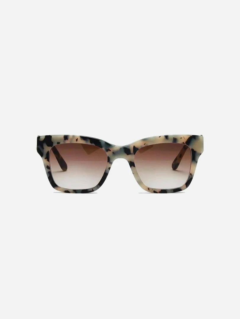 Malaika’s thicker square shape and clean silhouette is beautifully balanced, providing a modern take on a design that draws its inspiration from the spirit of the Sixties. In a distinctive grey tortoiseshell with graduated brown Grilamid lenses.
