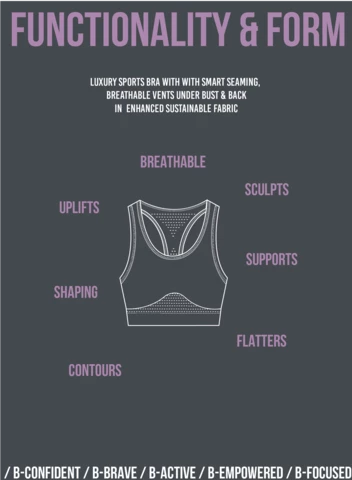 Reflexone’s luxury sports bra with smart seaming, breathable vents under bust and back in enhanced sustainable fabric. Flattering, breathable and supportive, the B-confident sports bra promises style and comfort.