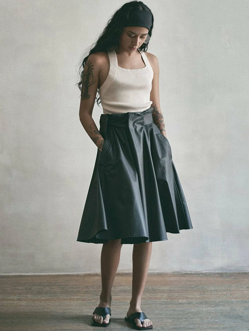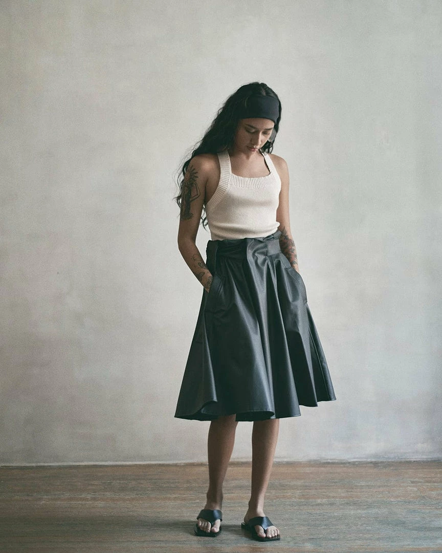 The Bloom skirt is made from cactus vegan leather, made sustainably and ecologically certified. It carries a loose cut that will feel good and fit any body type. It will suit a working attire or a social event and can be fastened at the desired height with its convenient built-in cactus vegan leather belt.