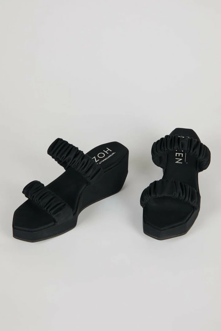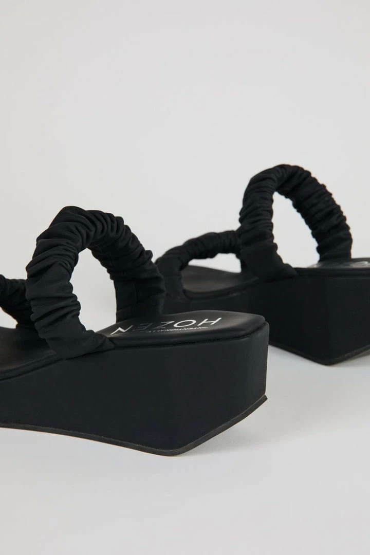 The Phorna scrunchie flatform has a structural modern shape, with scrunch-inspired straps that hold the foot on a memory foam padded sole. Pair it with the accompanying Scrunchie Bucket Bag, which shares the scrunchie-style handle.