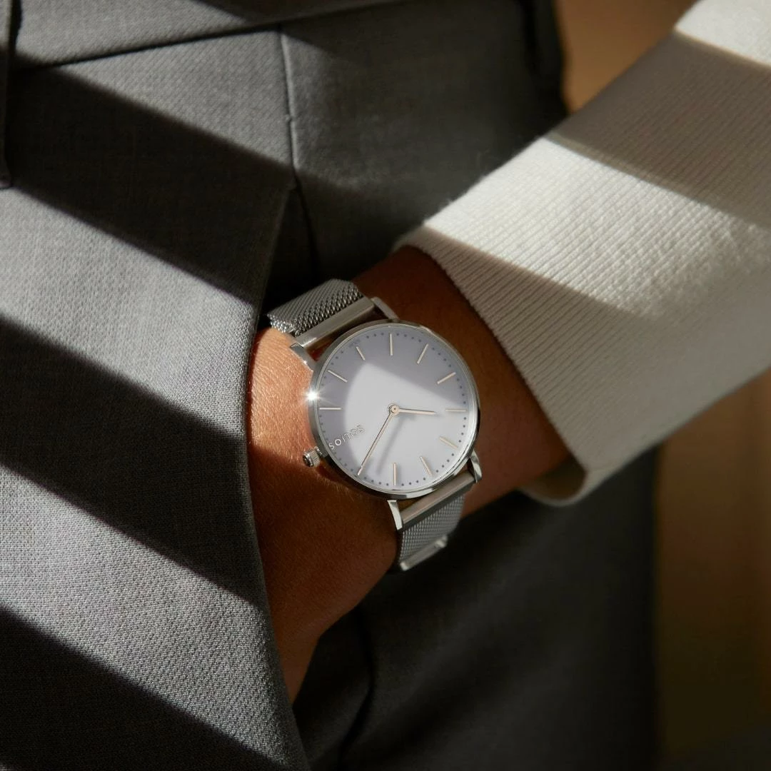 The 8mm thin silver-colored 316L stainless steel case is topped by a White dial with a minimalist style and offers a water-resistance of 3 ATM. The hardened mineral glass is covered with a robust sapphire crystal to limit scratches. At the heart, a solar cell allows the watch to recharge by itself and offers a 6-month energy reserve. In addition to promoting slow fashion with style, you’ll never have to change your battery.