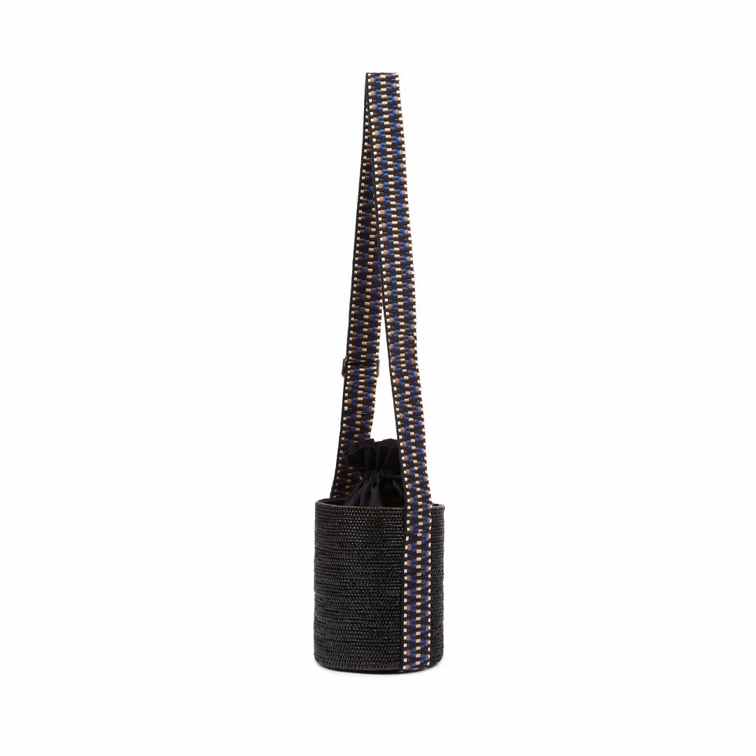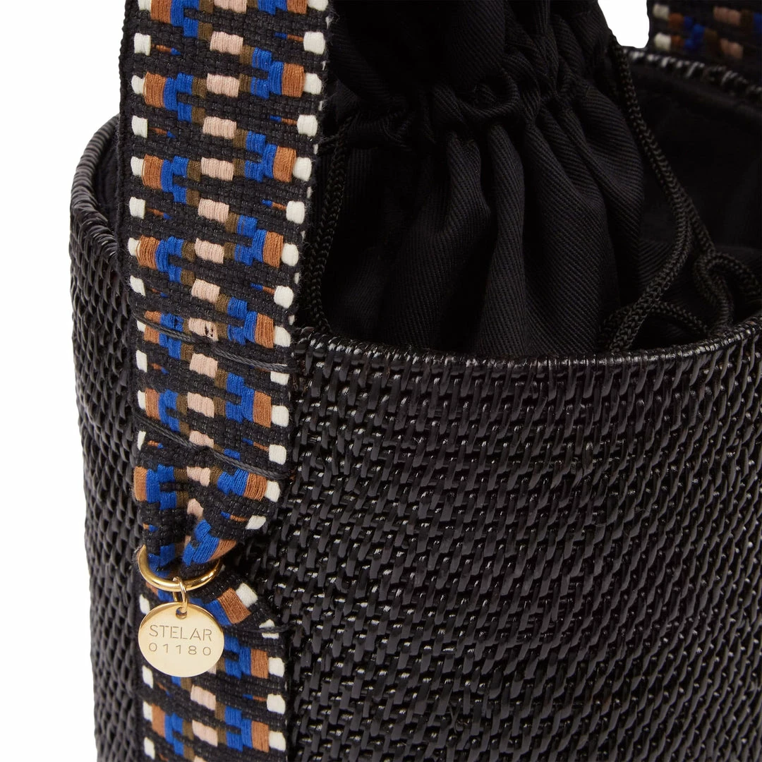 This bucket bag is lined in black cotton canvas and has discreet drawstrings that can be pulled tight to keep your belongings secure. Â It is offset with our eye-catching indigo and black jacquard trim and yellow gold-plated hardware.