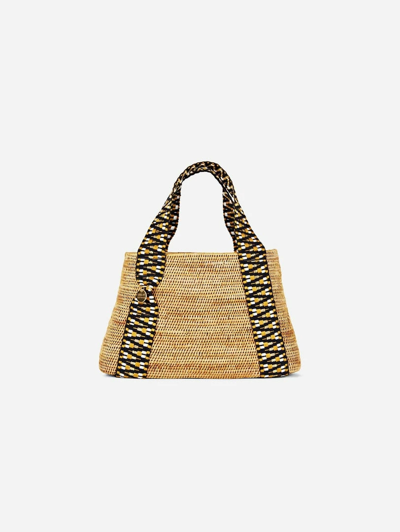 This Manado handwoven vegan oval bag combines understated design with STELAR’s playful touch. Handcrafted using organic and locally-grown Balinese atta grass, this bag is finished with an eye-catching black and gold jacquard which works seamlessly from day to night.