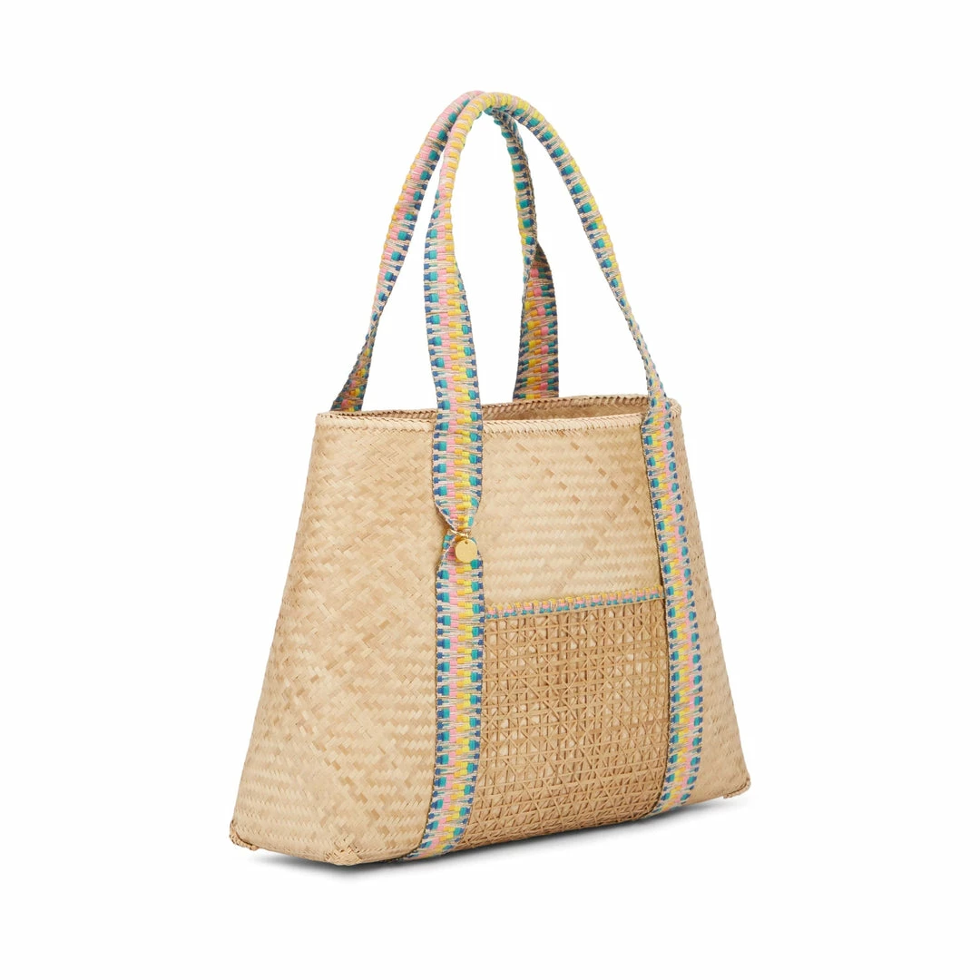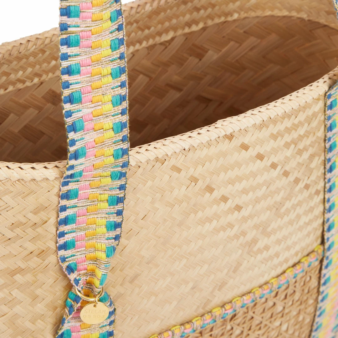 This vegan bamboo tote bag is a contemporary take on a summer favourite. Robust and lightweight in equal measure, it is handcrafted using traditional Lombokian weaving skills, offset with two sets of eye-catching rainbow jacquard straps. The intricately handwoven front panel pocket is perfect for holding your smaller beach essentials. Simply slip your sunscreen or sandy swimwear into the pocket and let the sand fall through the pocket.