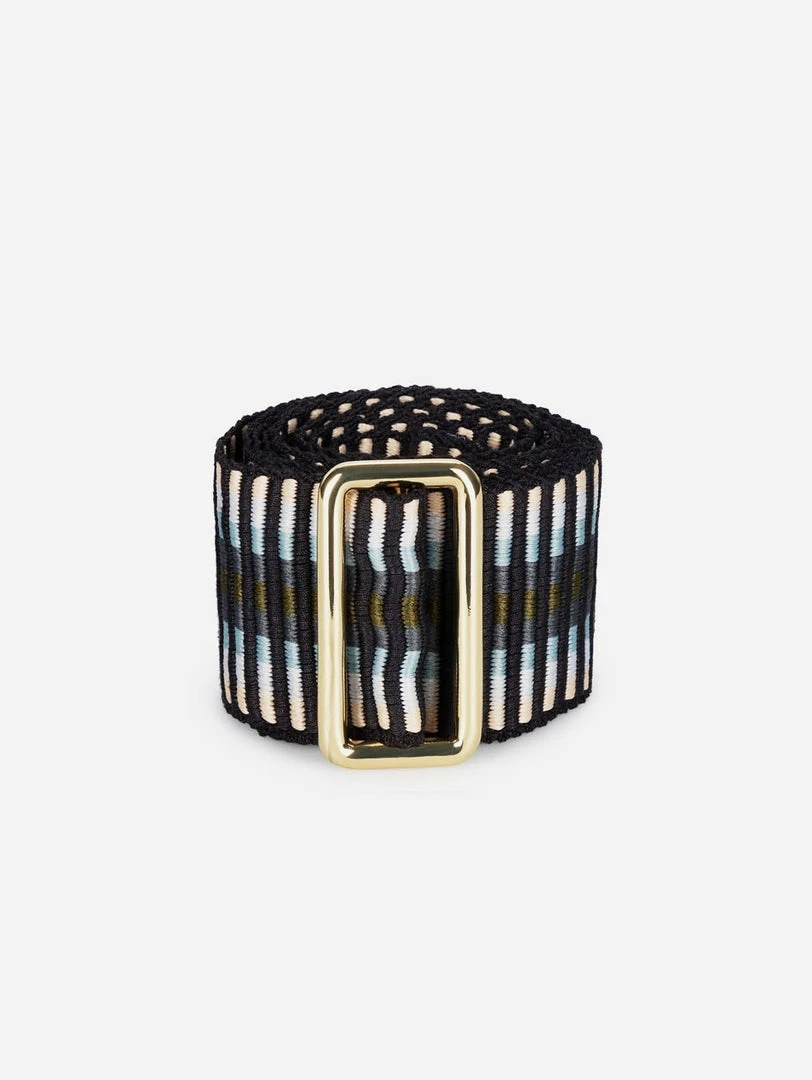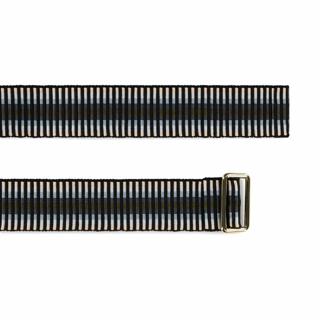 This striking jacquard belt focuses on traditional weaving techniques and is meticulously crafted from hand-washable cotton in olive, sky blue and sand, with a light yellow gold tone buckle.