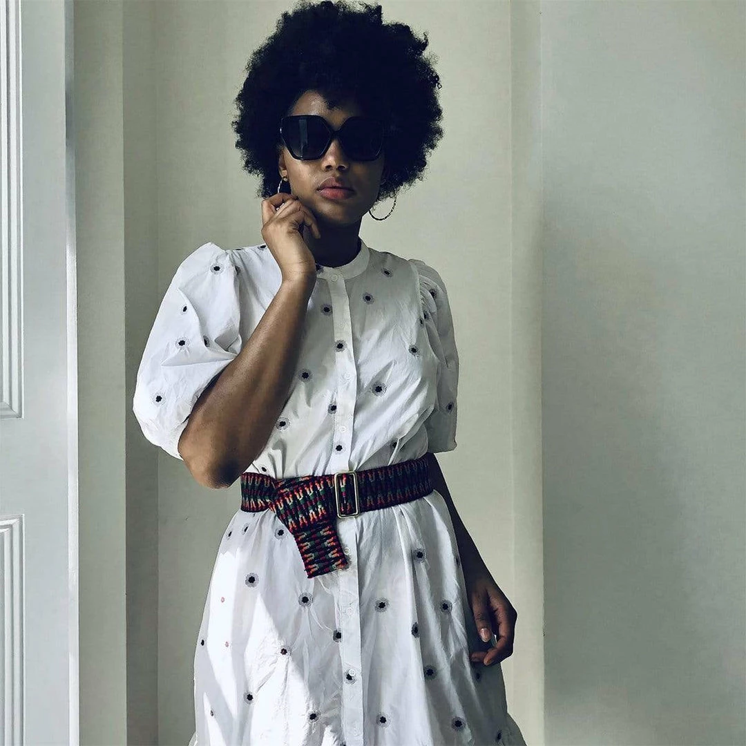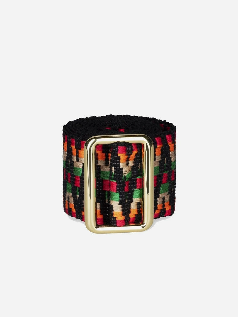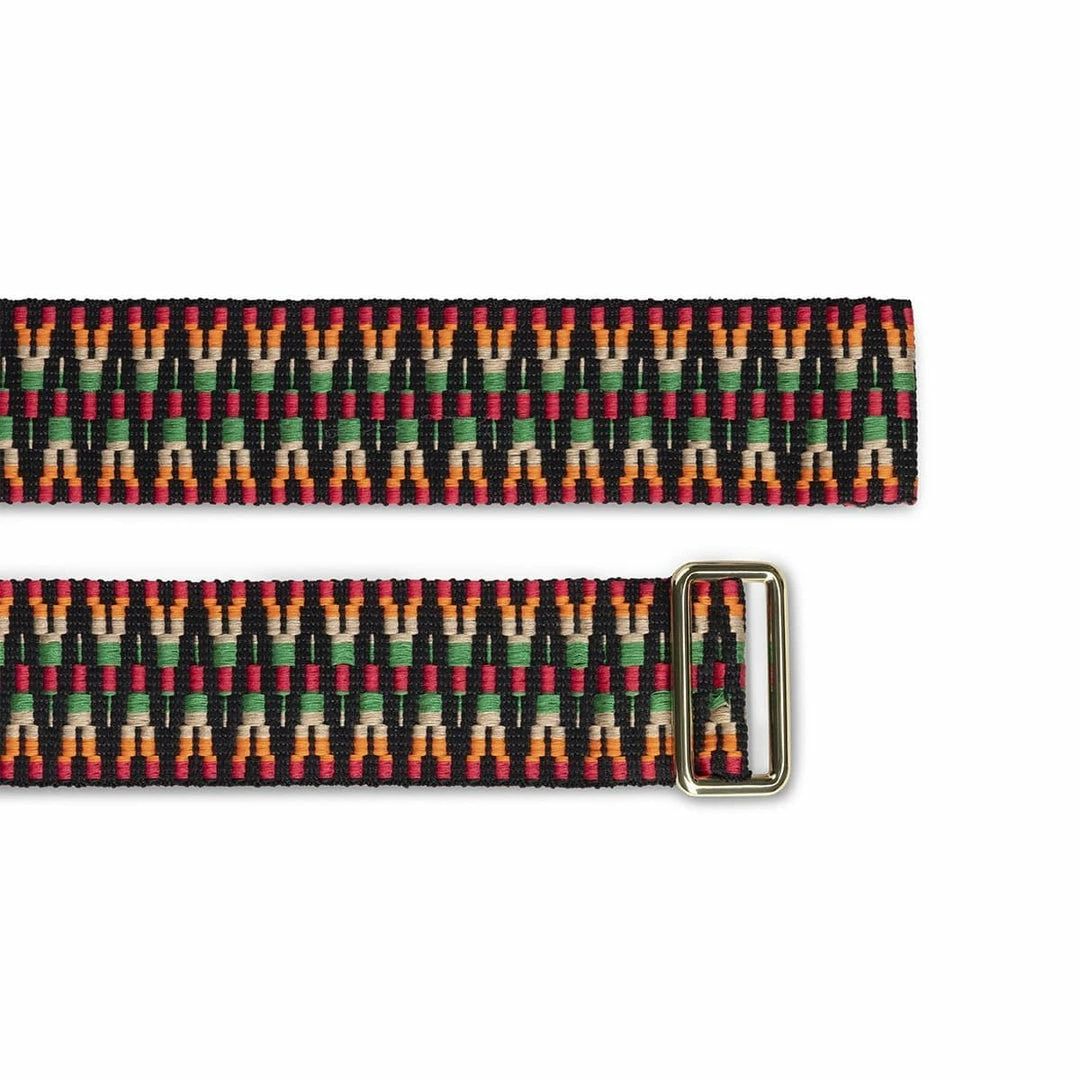 This striking jacquard belt focuses on traditional weaving techniques and is meticulously crafted from hand-washable cotton in red, cream, green, orange and black, with a light yellow gold tone buckle.