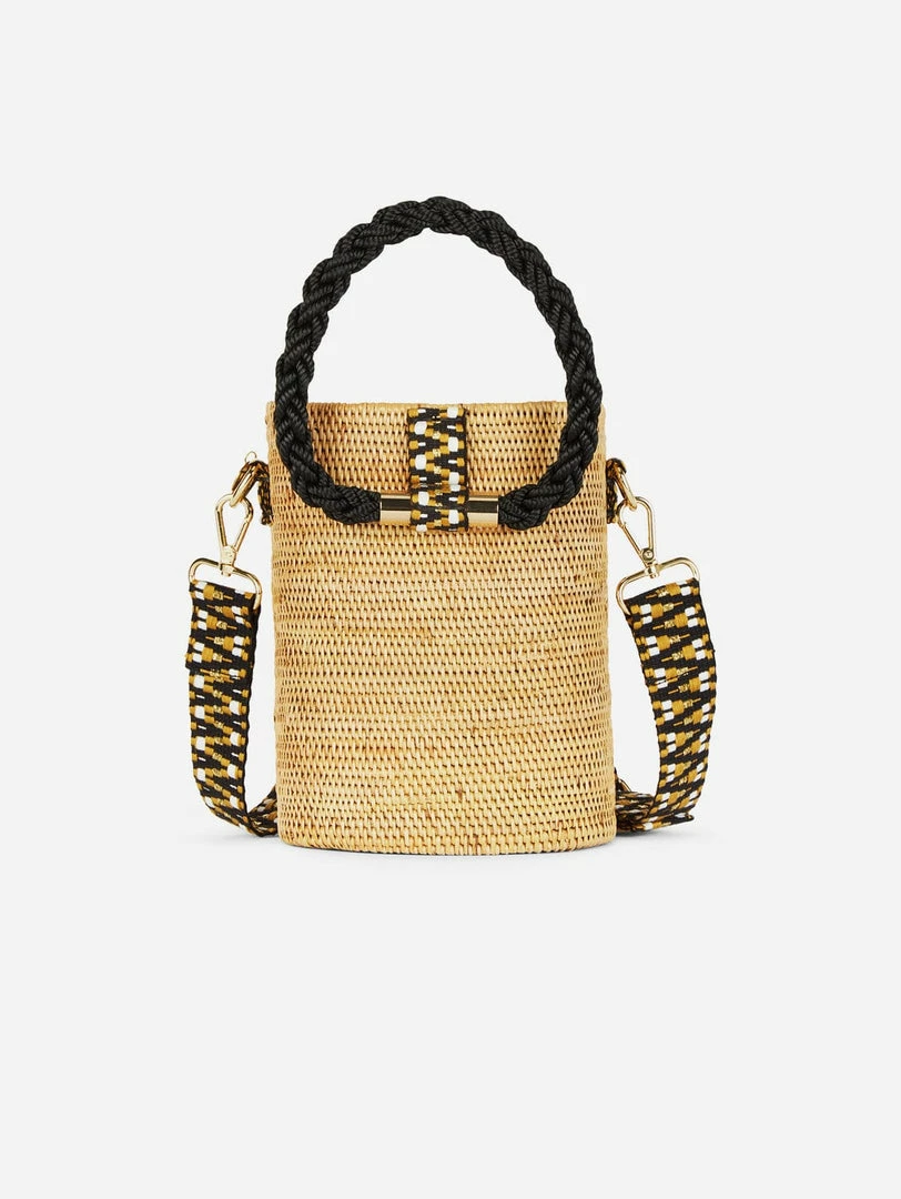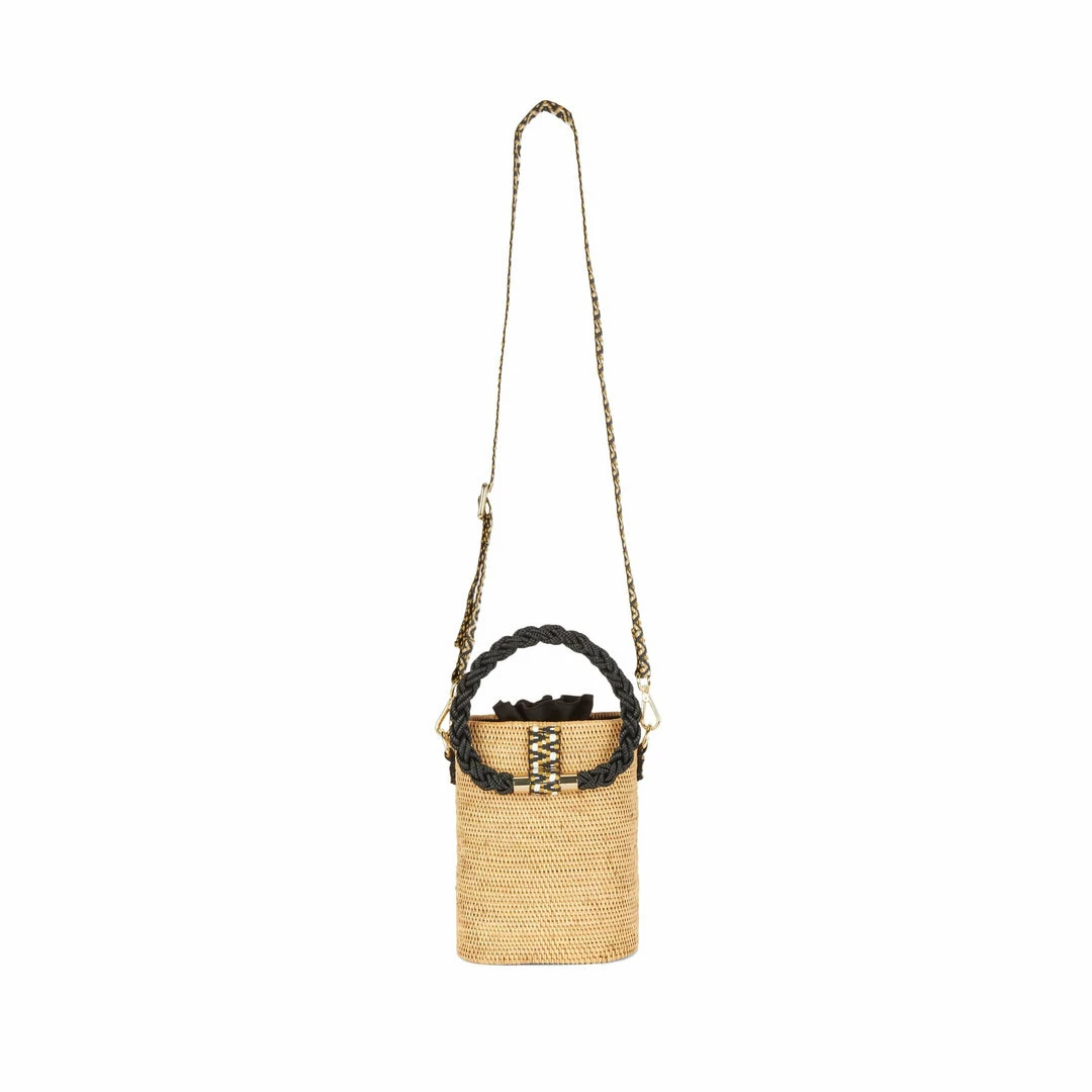 This vegan barrel bag is made from hand-woven natural atta grass that wears beautifully over time, and is perfect for vacation or balmy days in the city. It is lined with black cotton canvas that has drawstrings to keep your belongings secure. Carry by hand using the two black sailing rope handles or as a crossbody style by adjusting the detachable cotton jacquard strap.