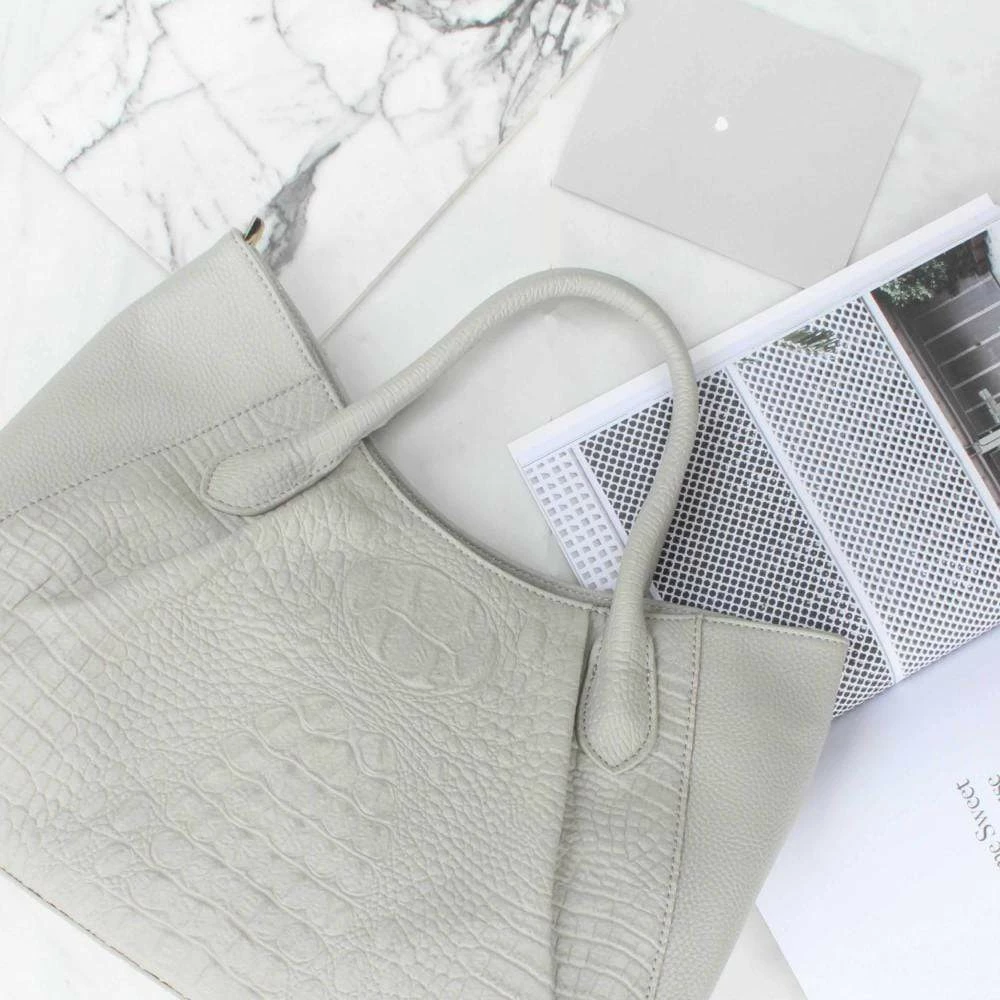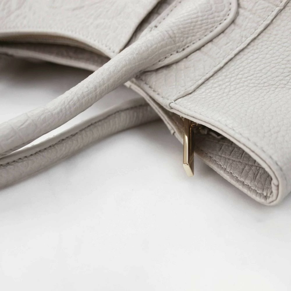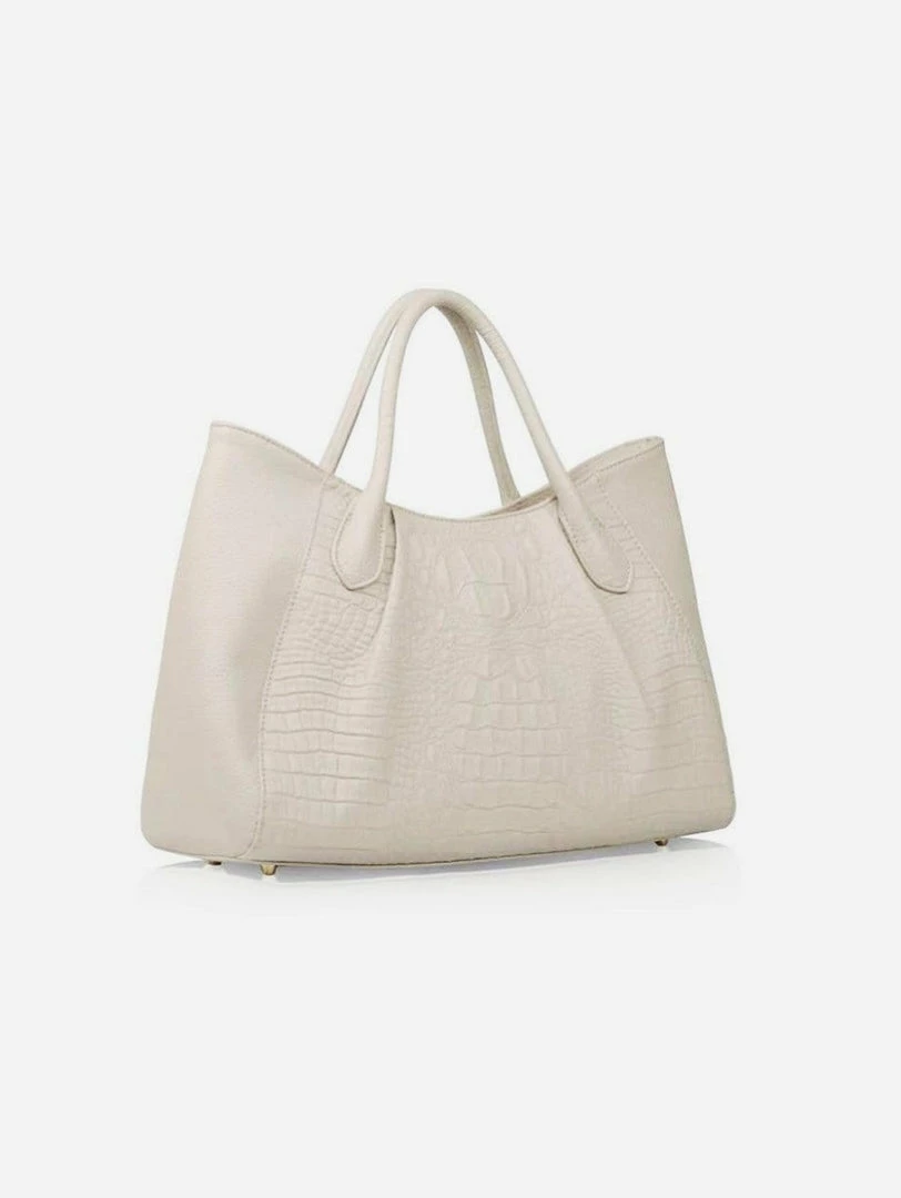 A lightweight contemporary tote bag made with textured vegan leather, the Georgia tote bag is a classic addition to your wardrobe with its modern and versatile shape and neutral tone. Wear it as part of a casual outfit, or as a work bag.