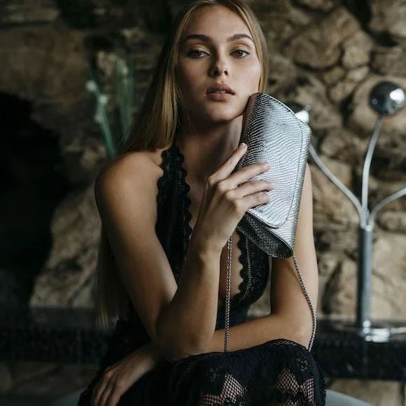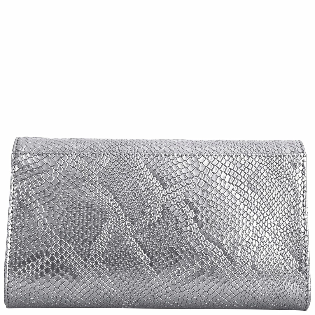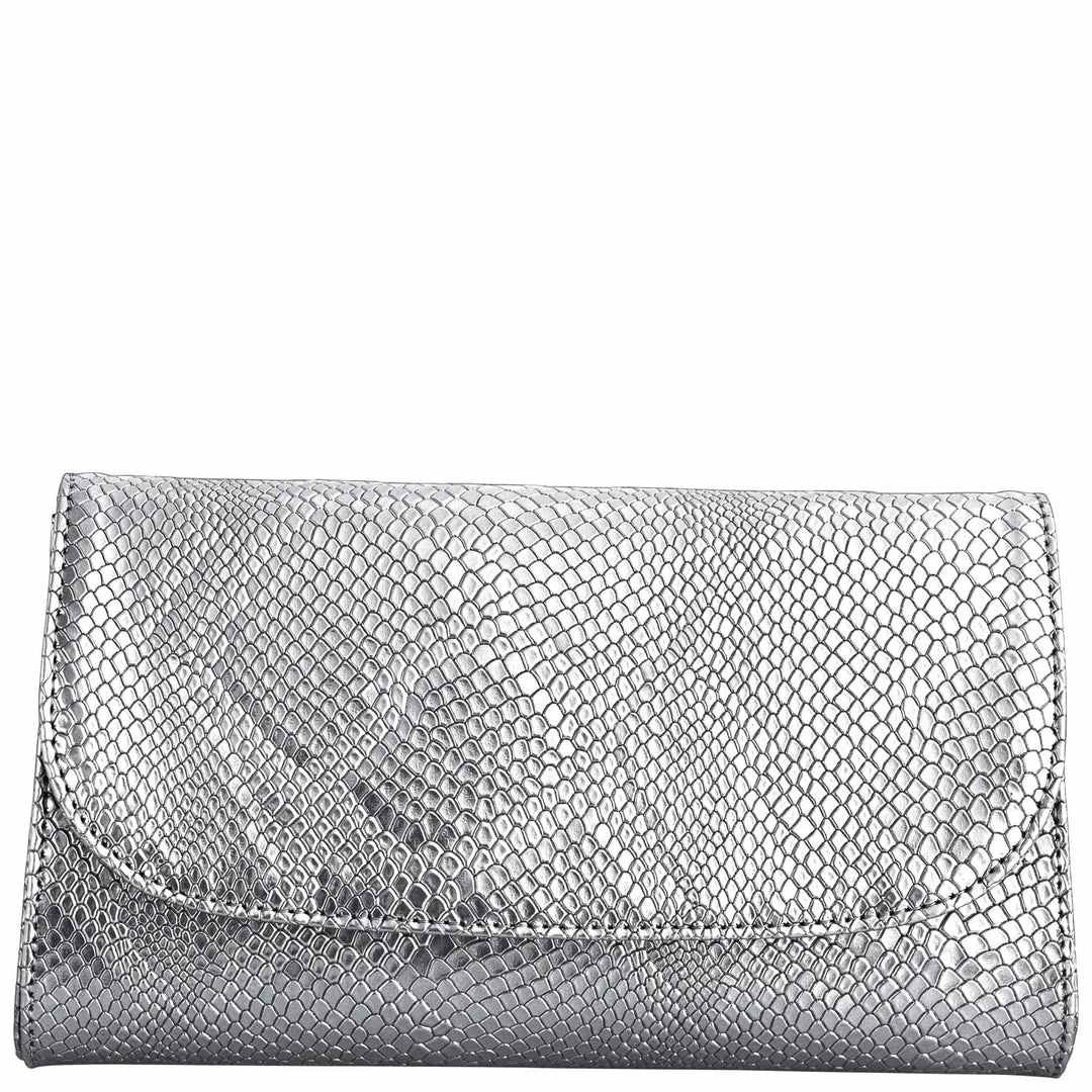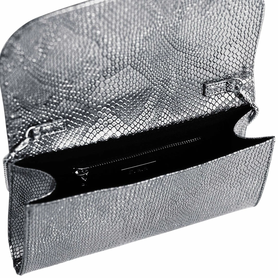 The Didi Clutch in Silver is perfect for a night out. This structured evening purse is handcrafted with luxurious Italian vegan leather, embossed vegan snakeskin, and has a detachable silver chain strap.