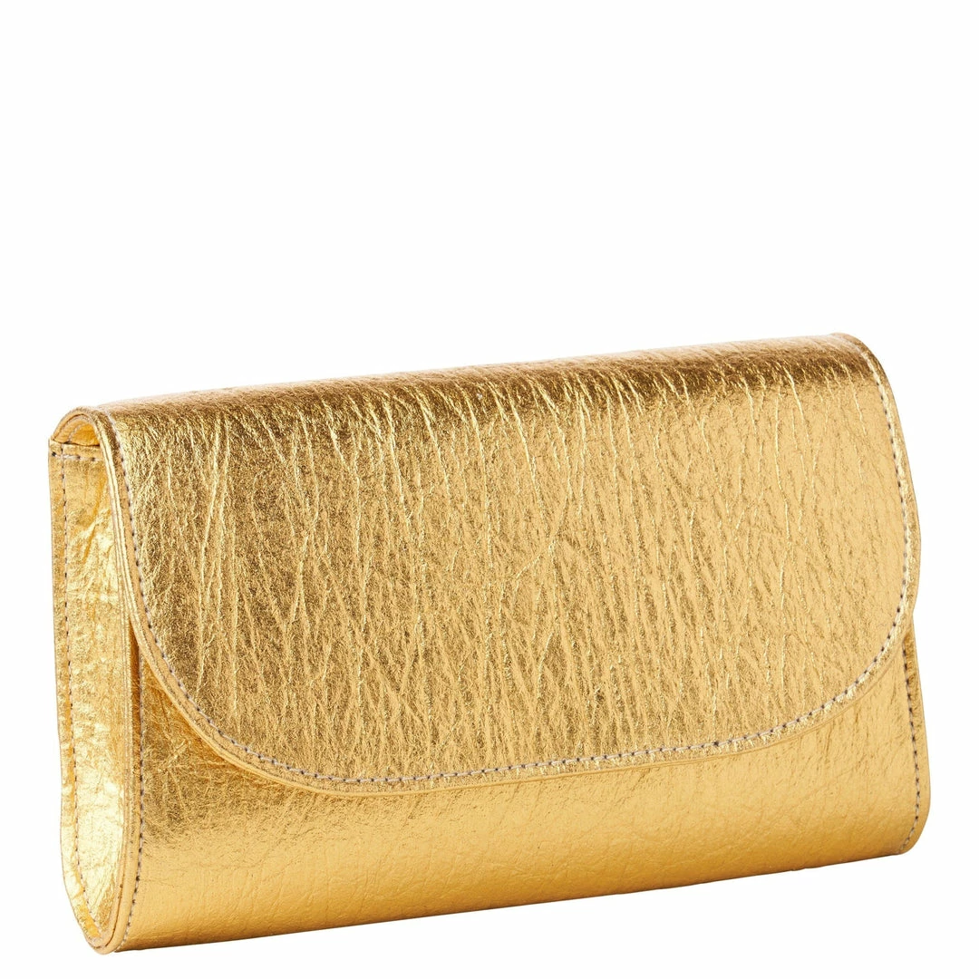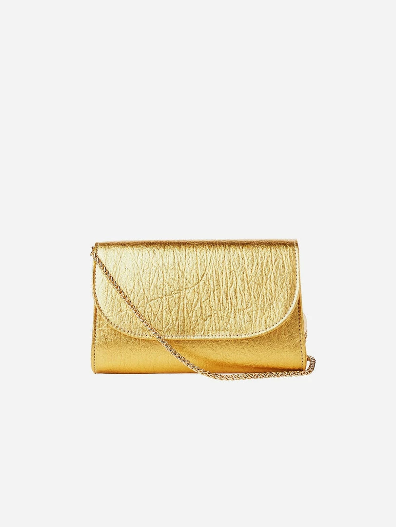 The Didi mini clutch is a structured purse that can be be used as a clutch or a shoulder bag by adding the detachable gold chain strap. Handcrafted from luxurious vegan metallic gold Piñatex®. Dress it up or down, your way.