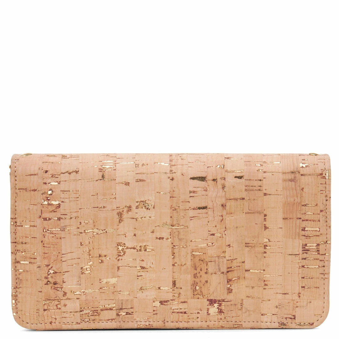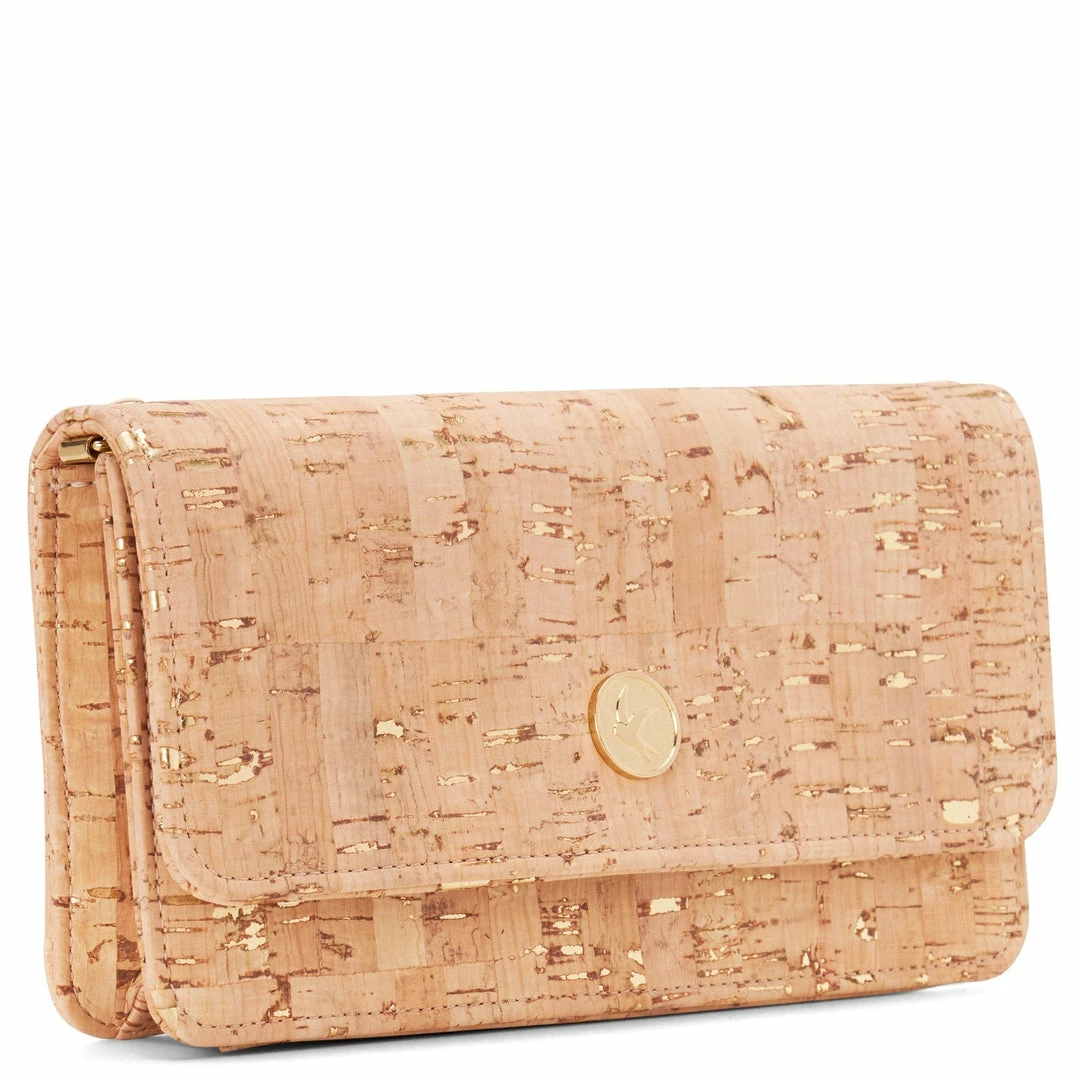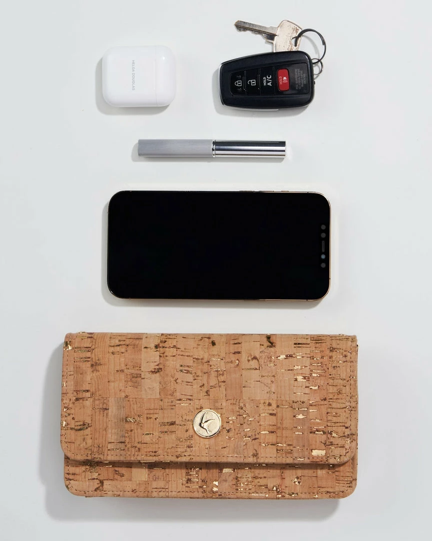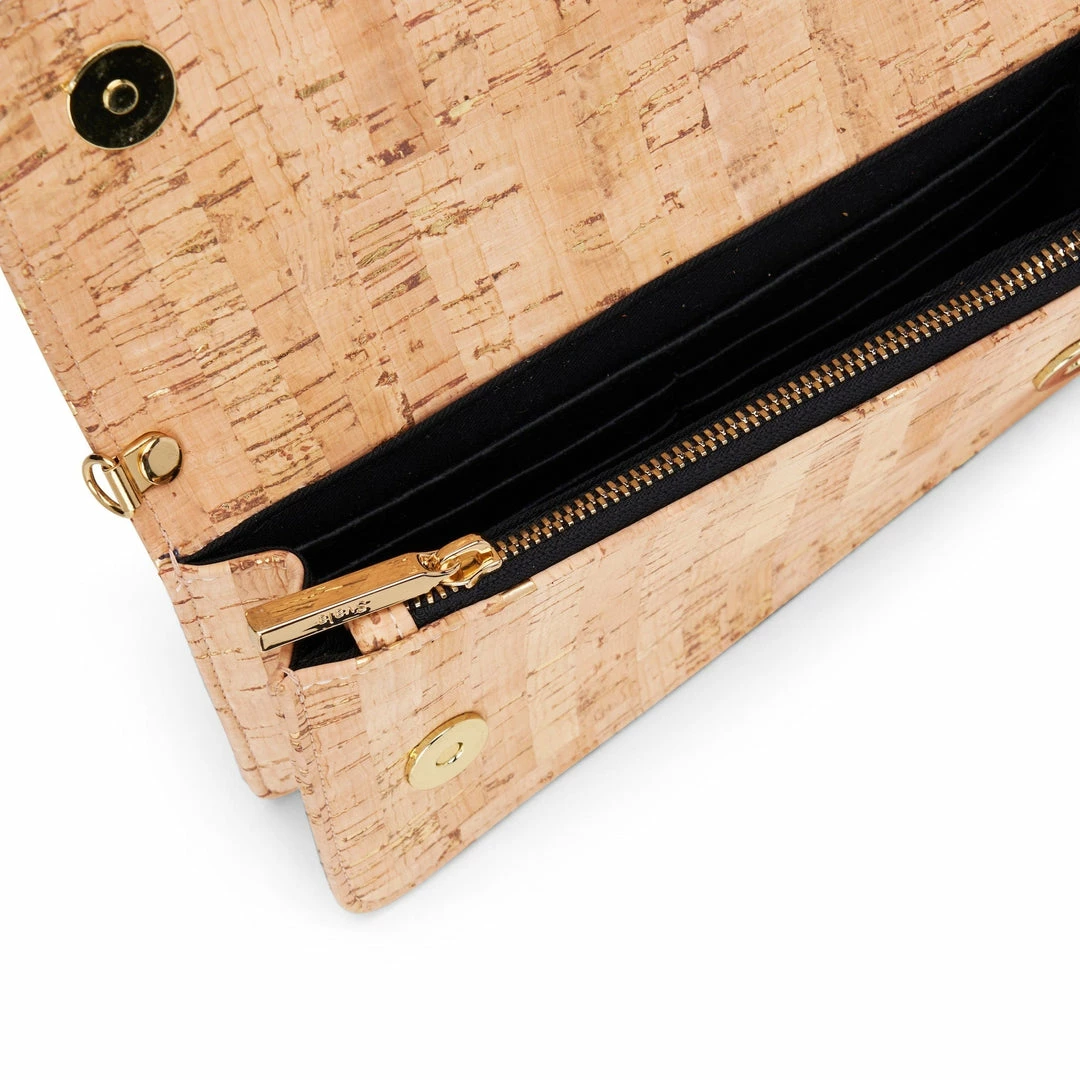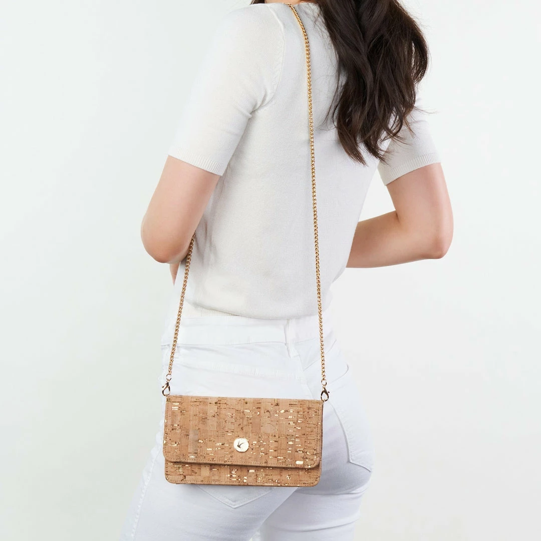 The Sara wallet purse is perfect for the girl on the go. This vegan wallet is great for daily use and doubles as a purse – just add the detachable gold chain or crossbody strap. This convertible wallet is handcrafted from gold speckled cork premium cork from Portugal.