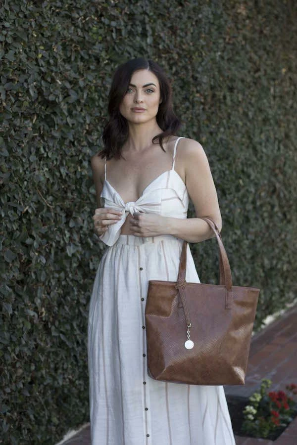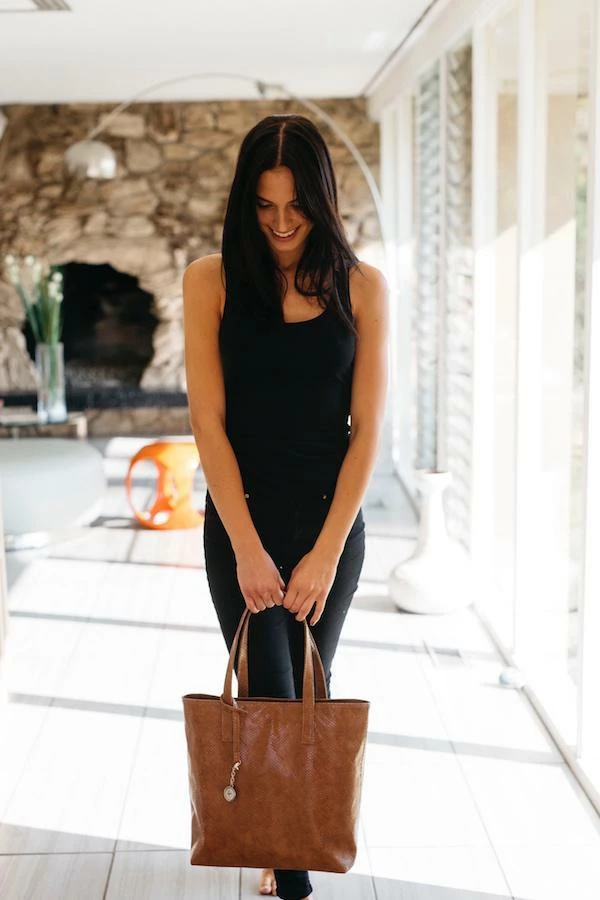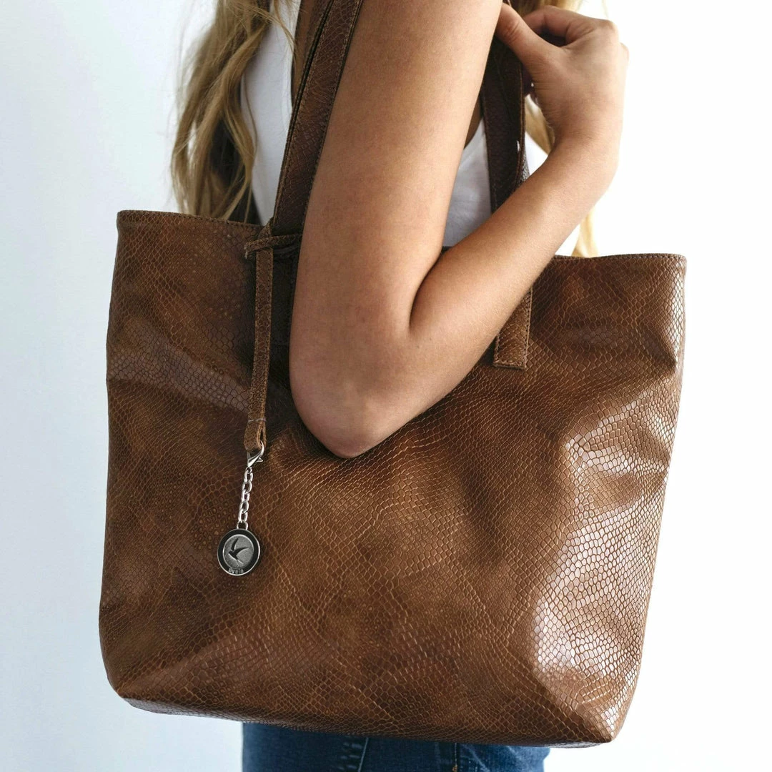 The Simma tote in brown luxurious Italian vegan leather, embossed faux snake-skin, can take you from work to the weekend. This lightweight bag is large enough to hold your daily essentials, including a 13” Macbook. Practical, stylish and fully sustainable, this bag is a must-have!