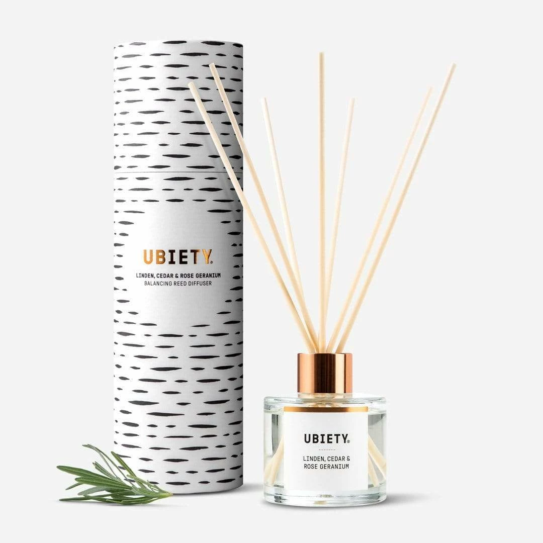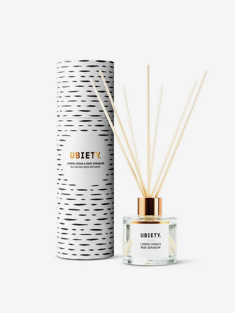The Ubiety Balancing reed diffuser uses a comforting blend of essential oils, including the smoky wood and green aromas of linden, cedarwood and rose geranium, expertly chosen to calm and balance the mind.