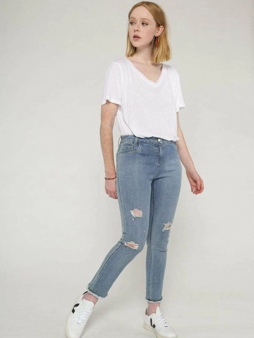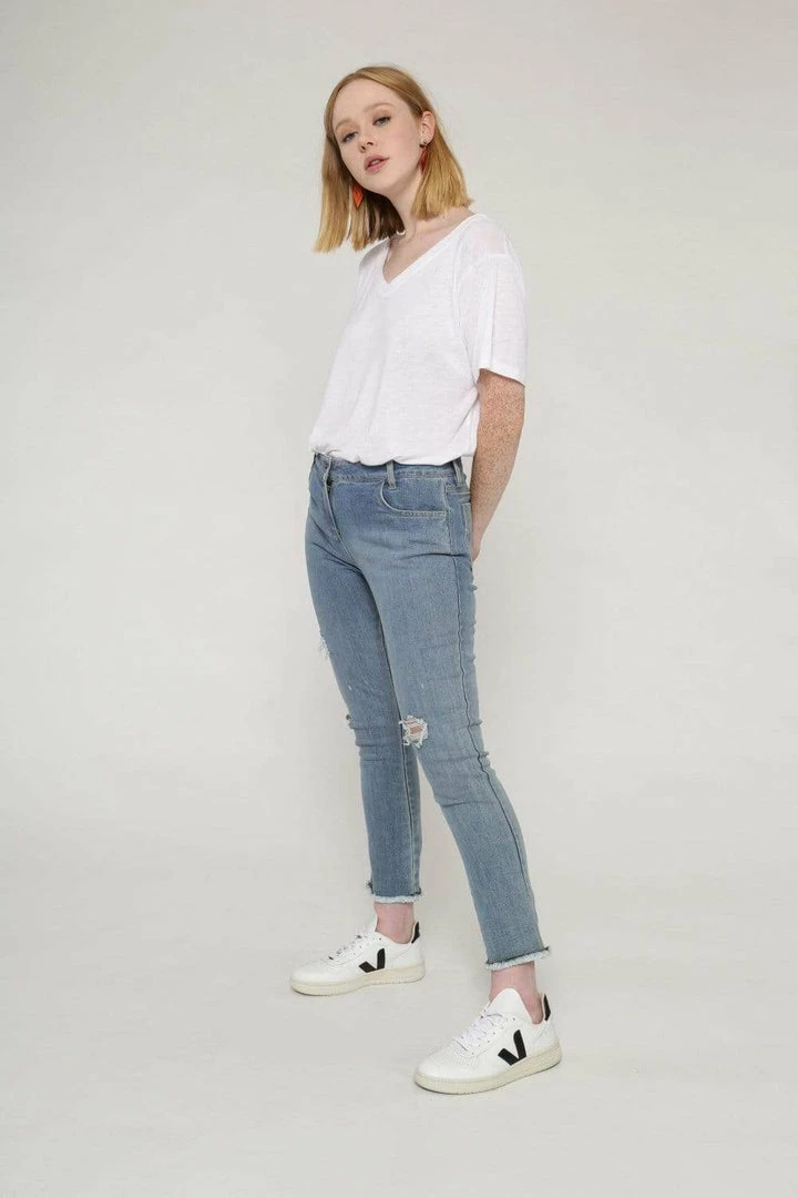 VILDNIS’ slim fit ankle-grazing jeans are made for weekends. Fusing traditional five pocket styling with contemporary VILDNIS signature stitching, rip detailing and frayed hems, you need only pair them with T-shirt and sneakers for a confident weekend look. You’ll get a lot of wear out of these worn-look jeans, too – the soft washed organic cotton denim with a hint of movement-enhancing elastane creates a comfortable second skin you’ll never want to shed.