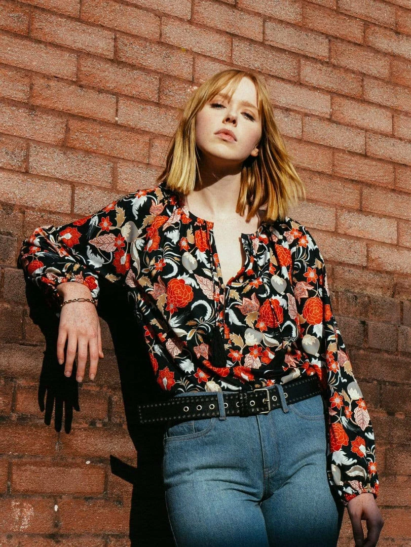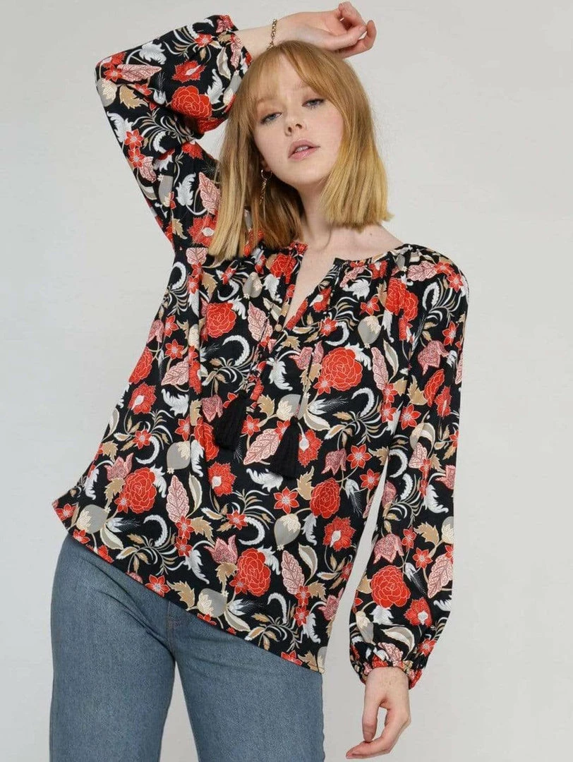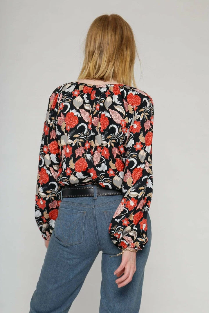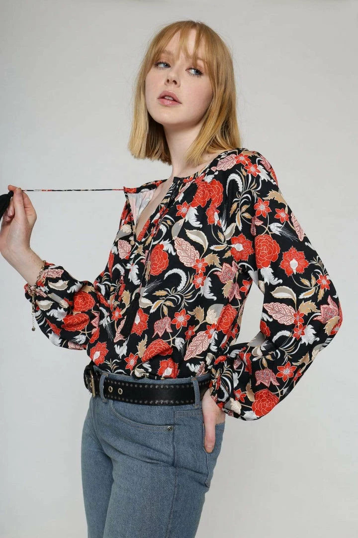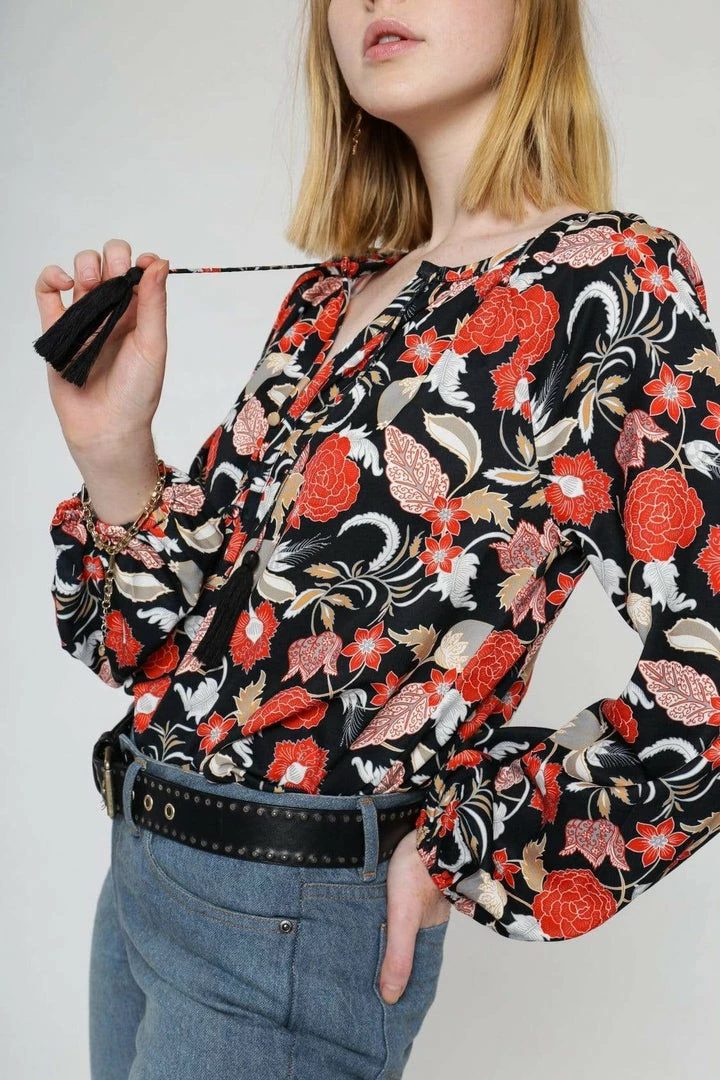 Add some colour in this bohostyle allover printed blouse in VILDNIS’ bespoke bold indoprint inspired by traditional Indonesian batik prints. Featuring a deep placket at front with buttons covering in self fabric and ties with tassels, as well as long voluminous sleeves gathered in elasticated cuffs.