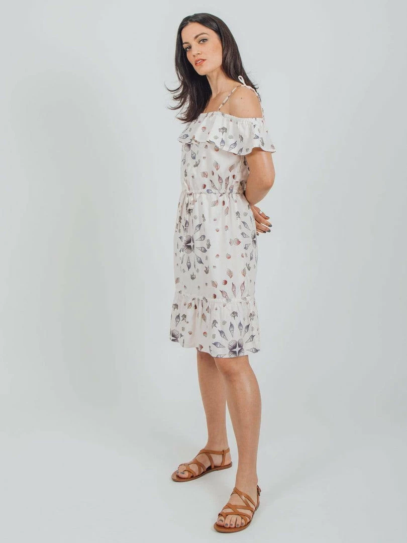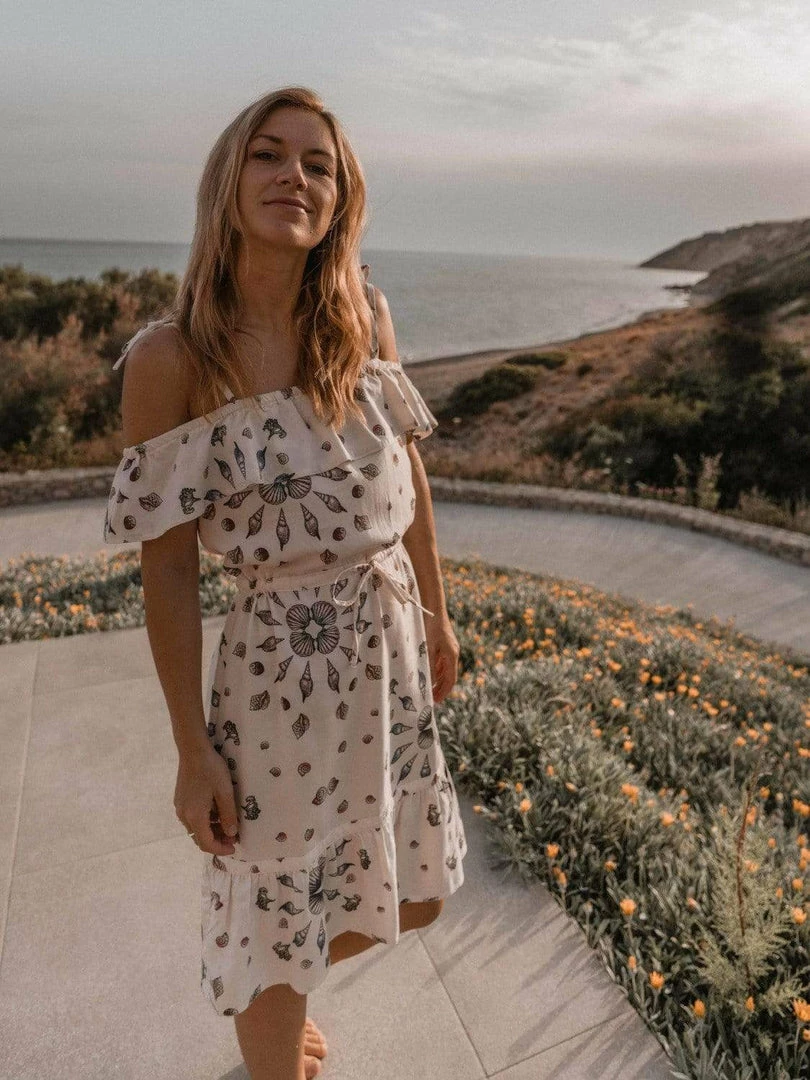 Bask in summer in VILDNIS’ Bardot style printed TENCEL™ dress. Exuding Denmark’s easy-living easy-dressing character with the sensuality of a wide off-shoulder frill and effortless wearability thanks to delicate support straps. VILDNIS’ bespoke seashell print takes you to the Scandinavian seaside, where the drawstring waist creates a secure feel and a cut-out back welcomes the cool breeze against a sun-kissed back. This summer must-have is just as kind to the scenery from which it’s inspired, made from the softest eco-friendly Tencel fabric and digitally printed for minimal environmental impact.