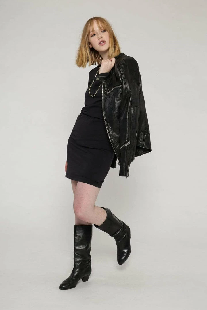 VILDNIS gives your go-to LBD a contemporary, eco-friendly update in slim-fitting lightweight jersey blending cotton and Seacell. Double fabric through the skirt provides extra structure and full coverage, with a subtly elasticated dropped waistline moulding effortlessly into a sleek feminine top contrasting a statement raw, slashed neck with extra long skinny sleeves.