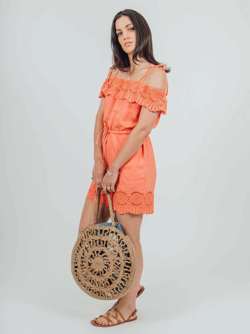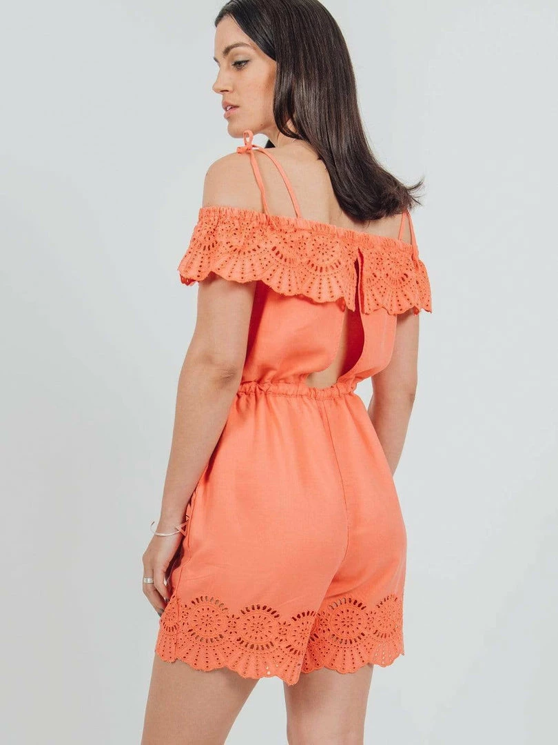 Get summer all tied up in this Bardot style romper in all-over burnt coral with a wide broderie anglaise off-shoulder frill, secured by delicate tie-up straps and complemented by a flattering drawstring waist. Femininity meets functionality with a cut-out back and broderie anglaise statement hem paired with side pockets and relaxed fit shorts. VILDNIS’ soft eco-friendly TENCEL™ fabric is as soft on your skin as it is to your conscience.