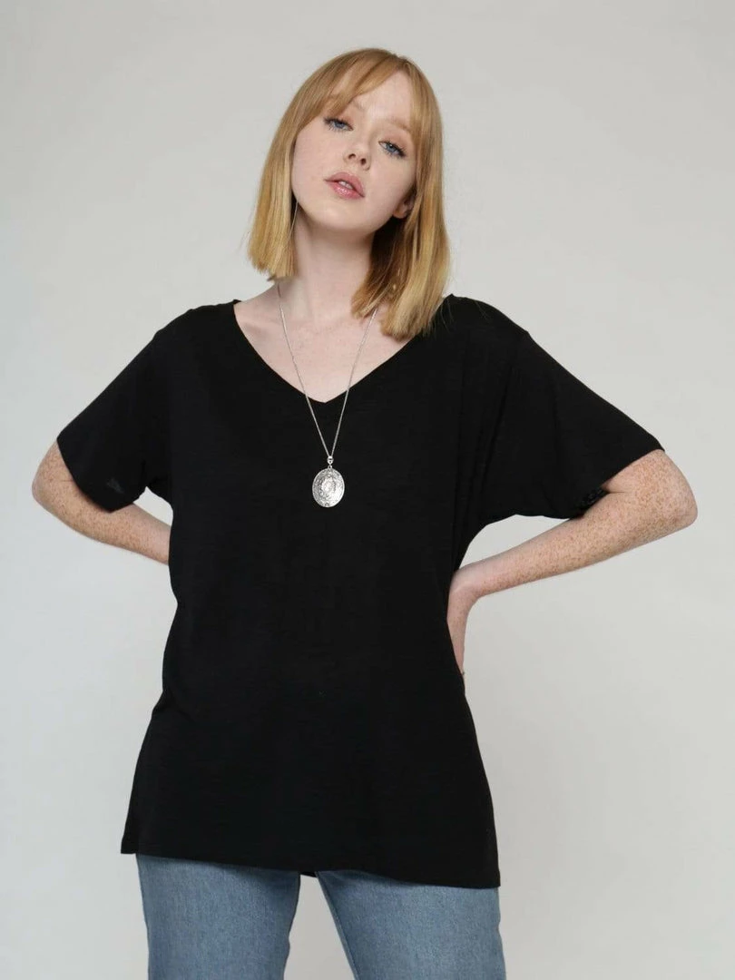 Made from an organic linen/lyocell blend, the over-size Waimea T-shirt feels liberatingly light and has a laid-back draped fit accentuated with a wide V-neck, dropped shoulders and sleeves. VILDNIS’ trademark unpolished aesthetic is evident in the centre-back stitching and split rib detail on the neckline.