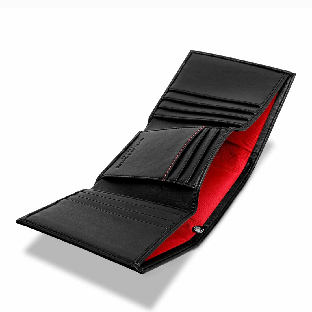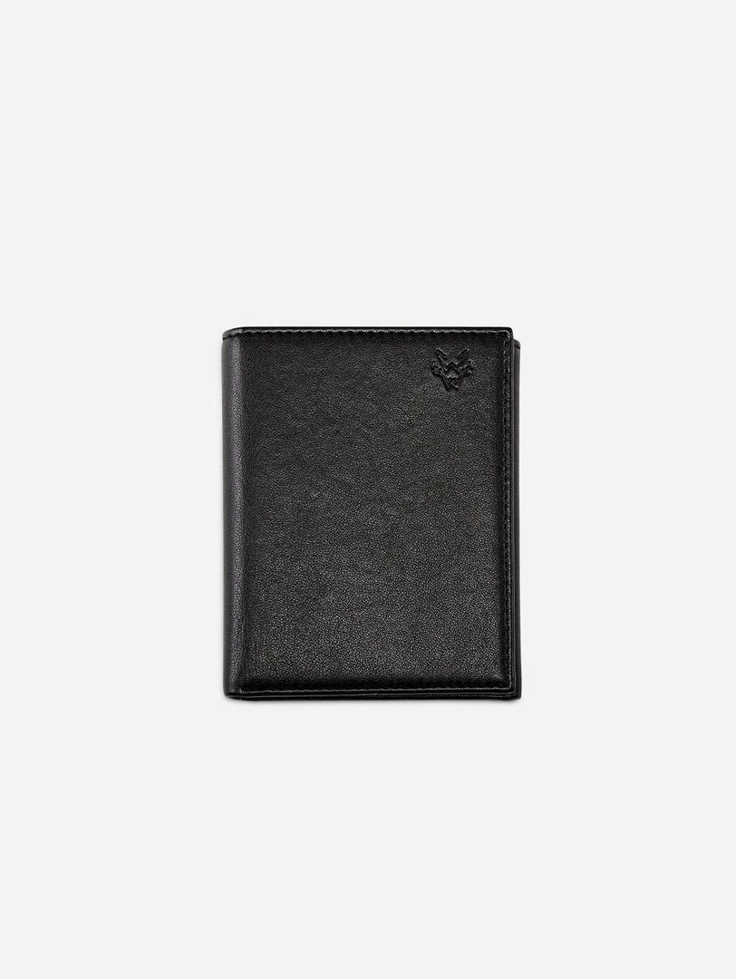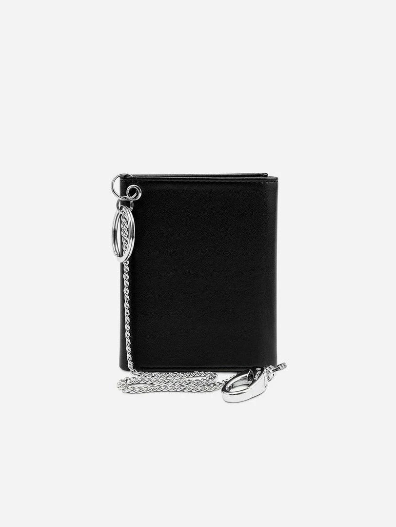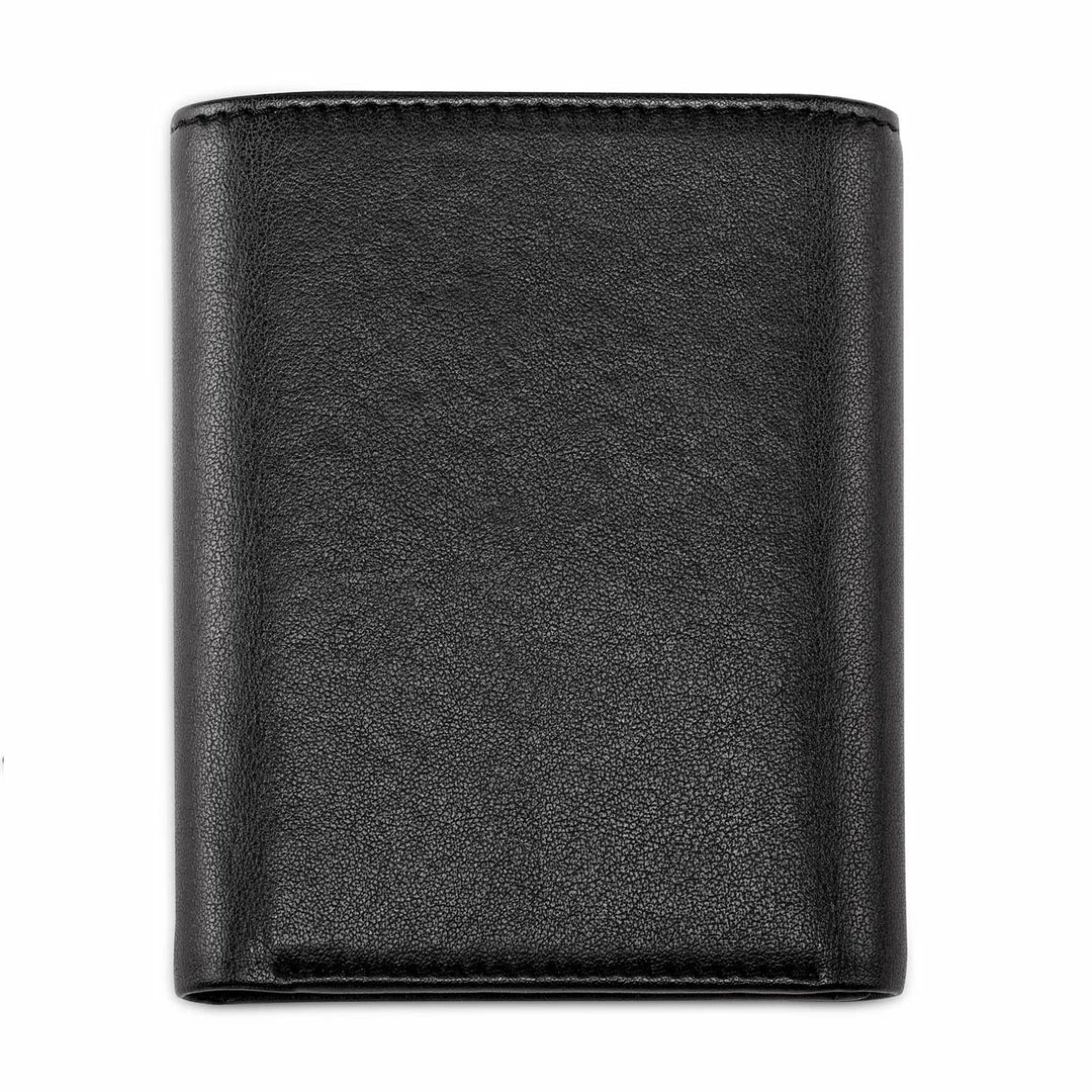 This trifold wallet in black has been beautifully handmade with eco vegan leather and features an eyelet for attaching a wallet chain. The innovative vegan leather is made with more than 50% oil from non-food grade corn. All the plant content comes from a renewable source so the material has a much lower CO2 footprint and is more environmentally friendly than other vegan leathers. There is a layer of PU on the top which provides benefits such as water, stain and scratch resistance.