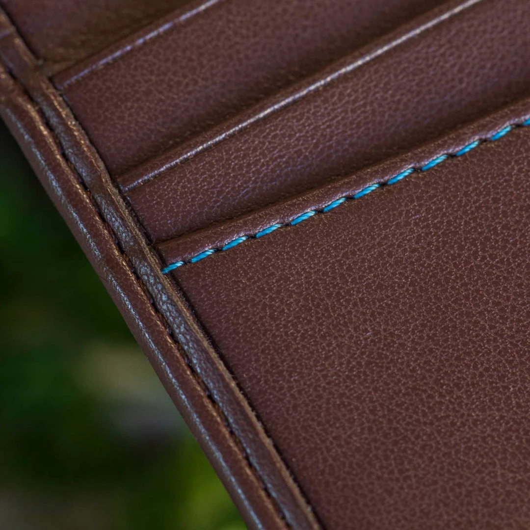 This vegan leather card holder in Chestnut Brown is individually handmade with high quality eco-leather. The innovative vegan leather has a base layer made from non-food grade corn and the final material contains more than 50% plant material. The corn is from a renewable source so the material has a much lower CO2 footprint and is more environmentally friendly than a regular vegan leather. On the top there is a layer of PU to provide benefits such as water, stain and scratch resistance.