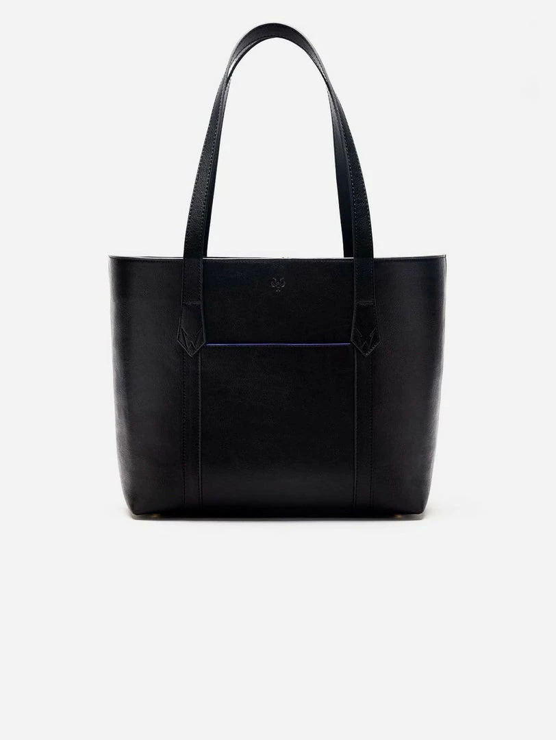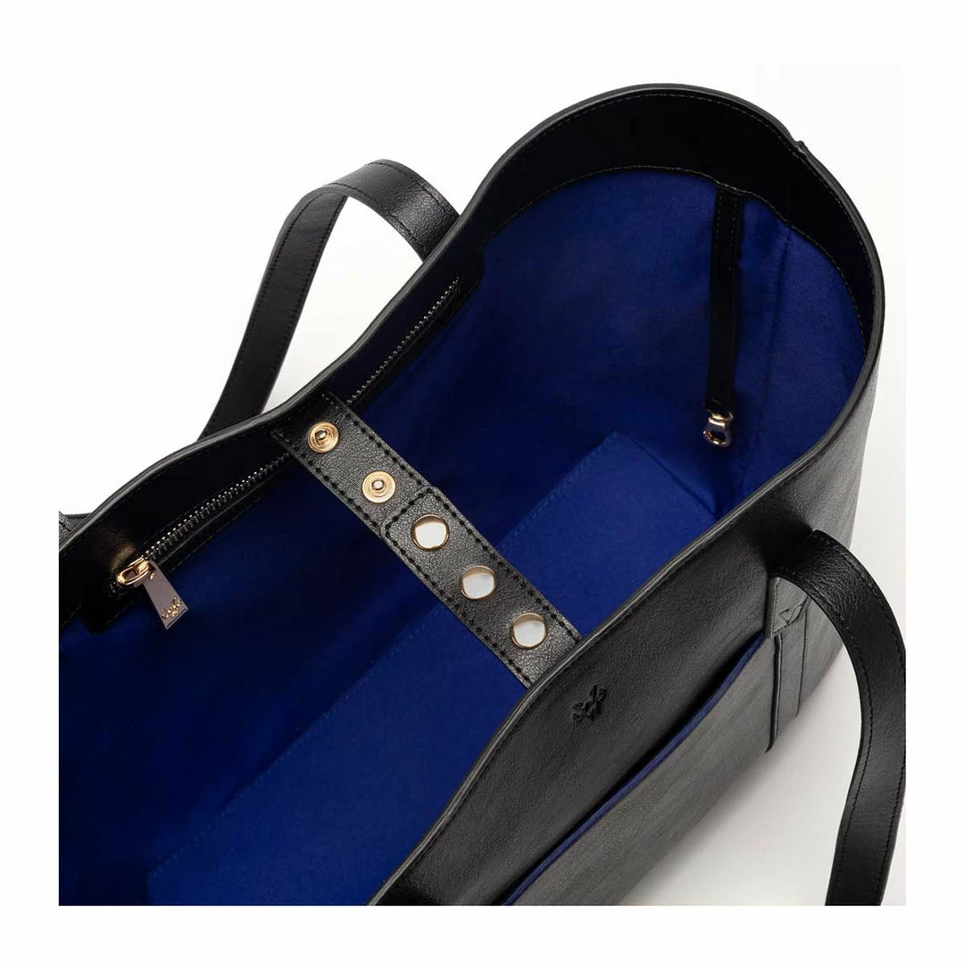 The bag has accents of colour with contrasting cobalt blue edge dye on the side seams and the top of the slip pocket.
