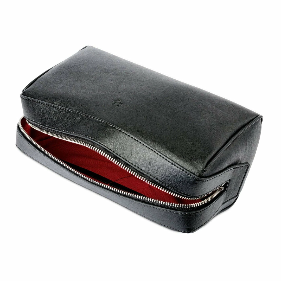 If you have struggled to find a high quality and elegantly designed non-leather washbag that can hold your favourite aftershave, toothpaste, shaving lotions or beard care accessories all in one place, then this could be the answer. Inside, there is a capacious centre compartment, a partially concealed full length zipped compartment and two smaller pockets. On the outside a magnetic snap closes a side pocket for handy access to smaller items.
