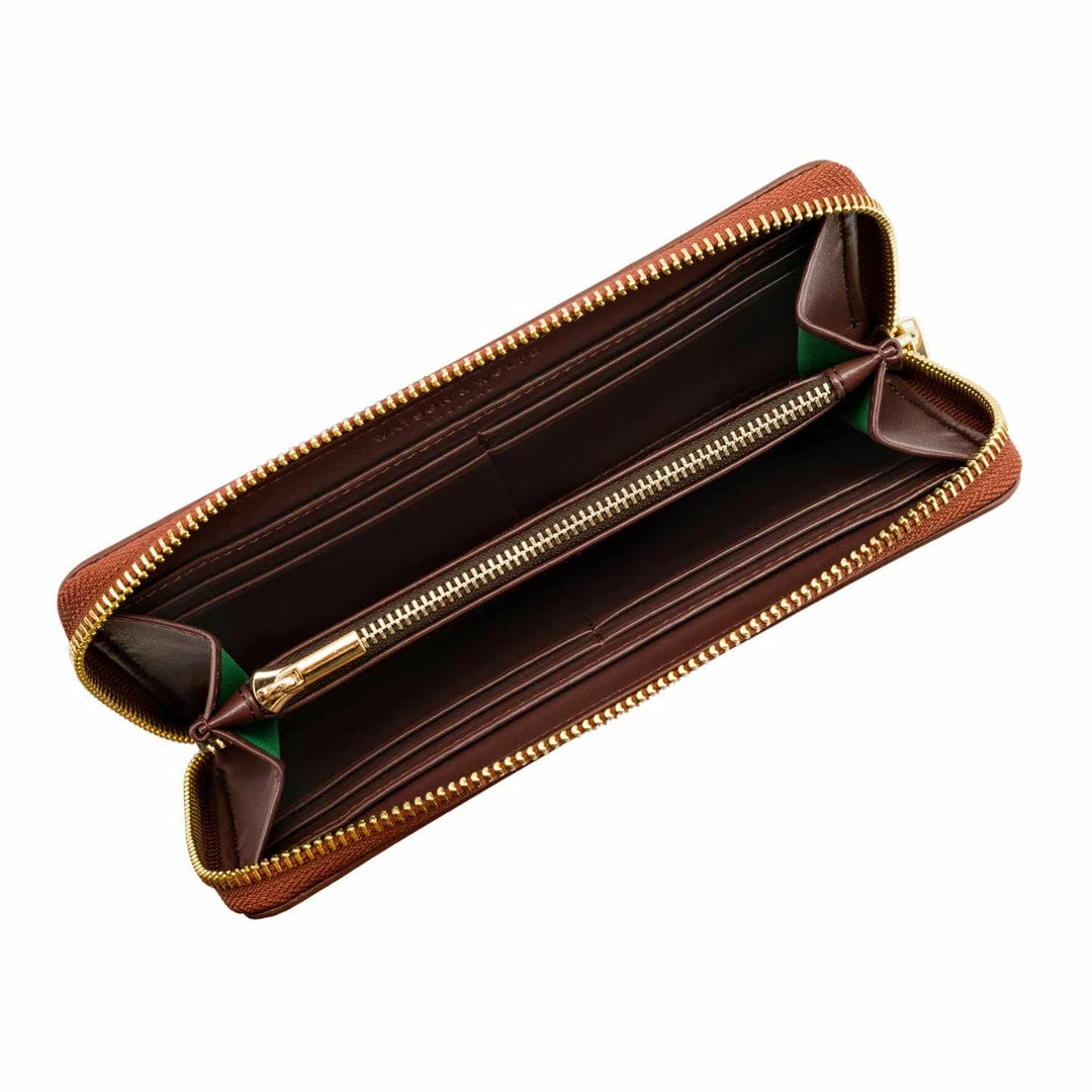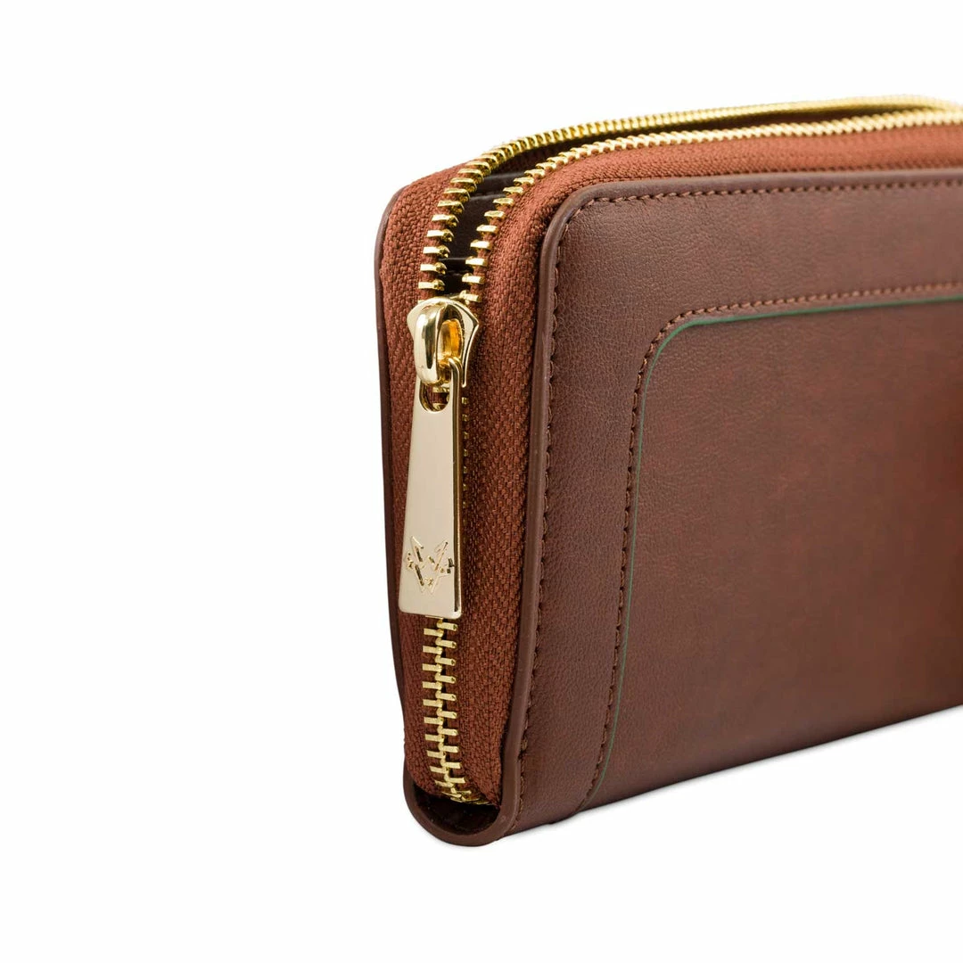 A classic design and shape for every day. This large zipped vegan leather purse in rust has all the pockets you could need for organising your cash, cards and coins. Features 8 card pockets, a zipped centre compartment for coins and 2 slip pockets for cash and receipts.