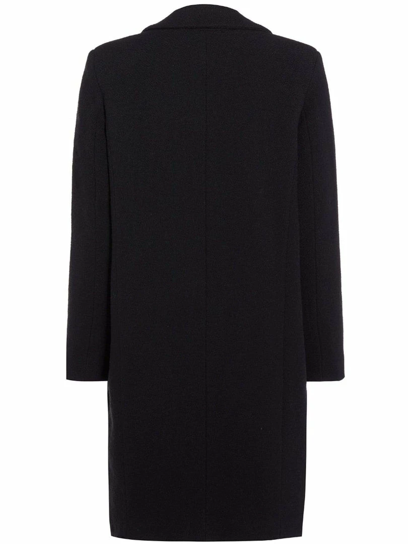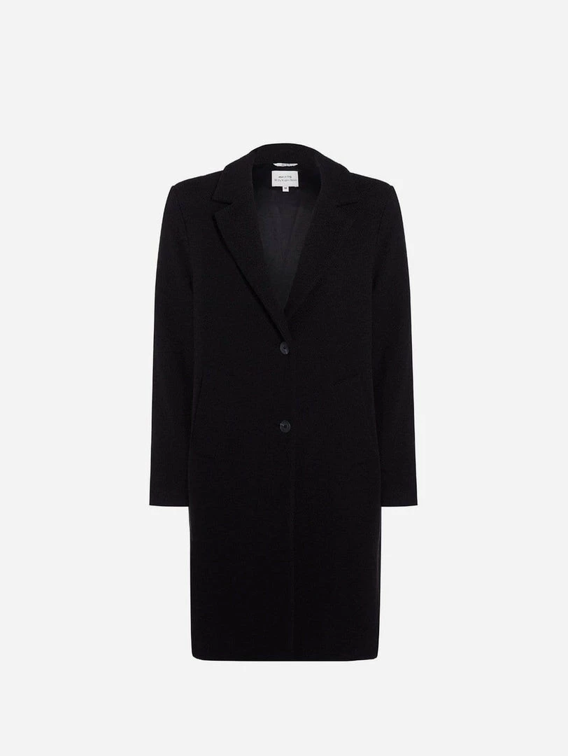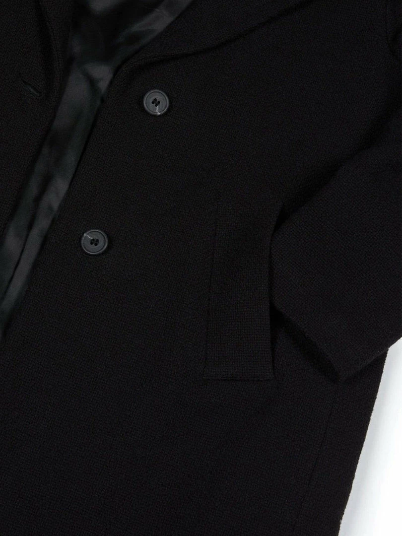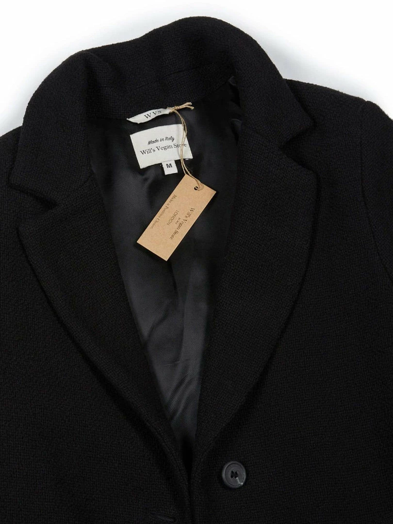 This understated and sophisticated coat is a timeless style you’re sure to wear for years. Tailored in Italy with vegan wool made from Greenpeace DETOX & Oeko Tex® standard 100 certified cotton. It’s designed in a loose, single-breasted silhouette with shoulder pads made from 100% recycled polyester. The front of the jacket is fastened with two matt finish buttons made from recycled compressed paper and resin. You can carry essentials into the two deep slip pockets. To keep you warm there is a 60g thermal insulated lining made from 100% recycled polyester. The Italian made REACH certified viscose lining ensures smooth layering, and being in black means it’ll go with nearly anything.