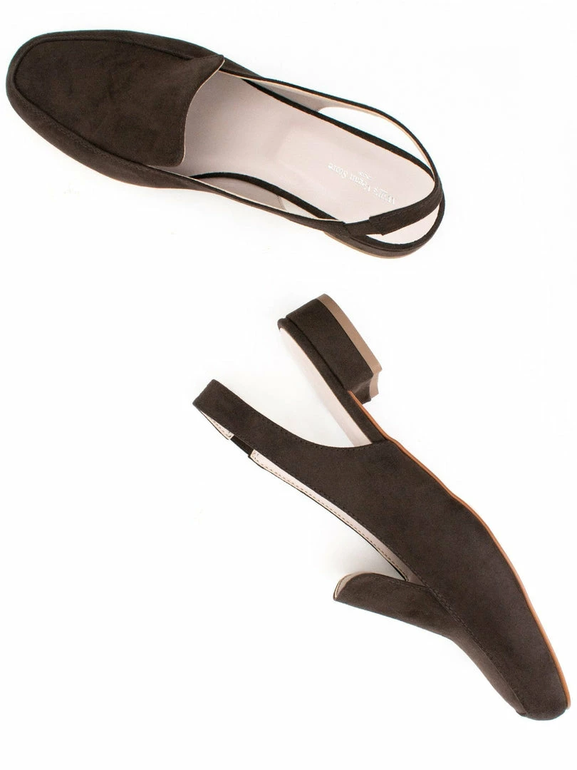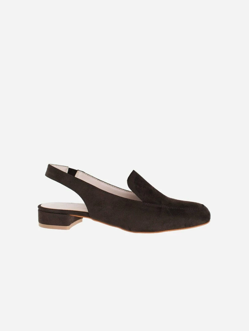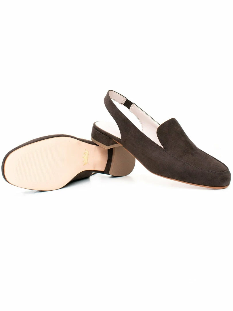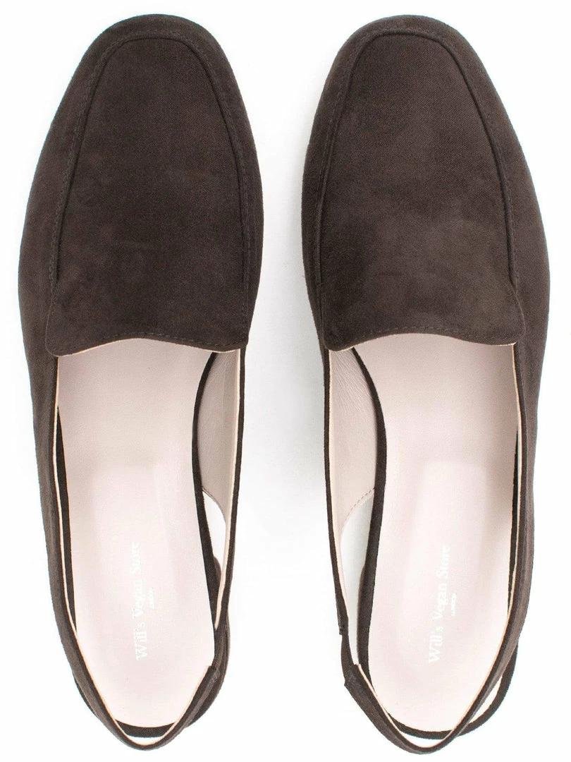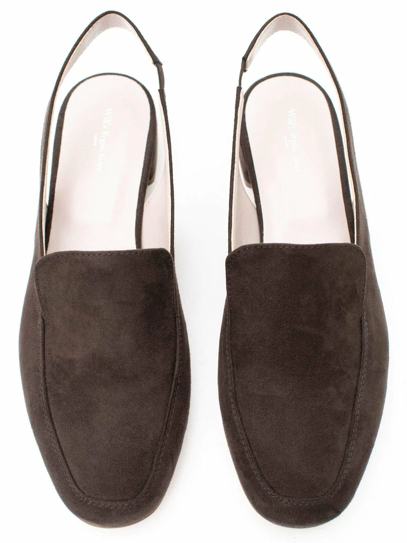These loafers are an elegant slingback design made in Italy from soft vegan suede. Featuring matching insole trim details, cushioning non crush down insoles and a small elasticated strip on the back strap allowing for the perfect fit to comfortably hug your ankle.Â