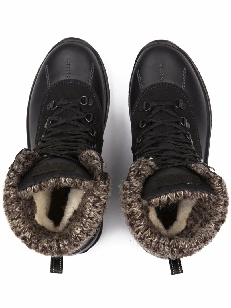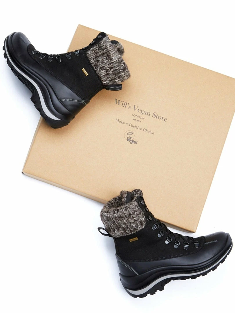 A vegan wool collar locks heat in the boot. Your feet sit in soft vegan shearling that luxuriously lines the inside down to your toes. The laces slide easily through the articulated lace hooks, pull on them to hug the boots against your ankles, for super comfy and snug boots.